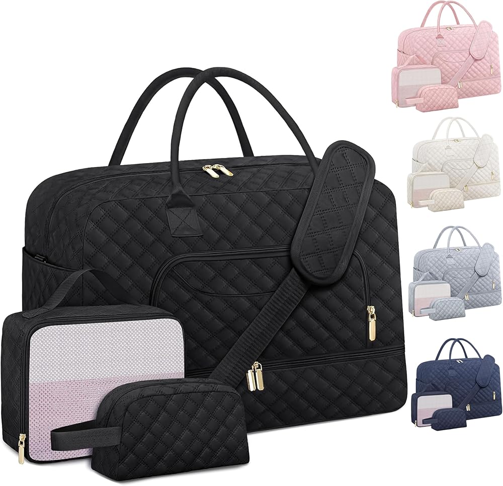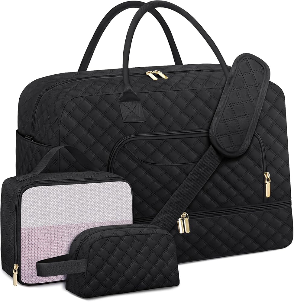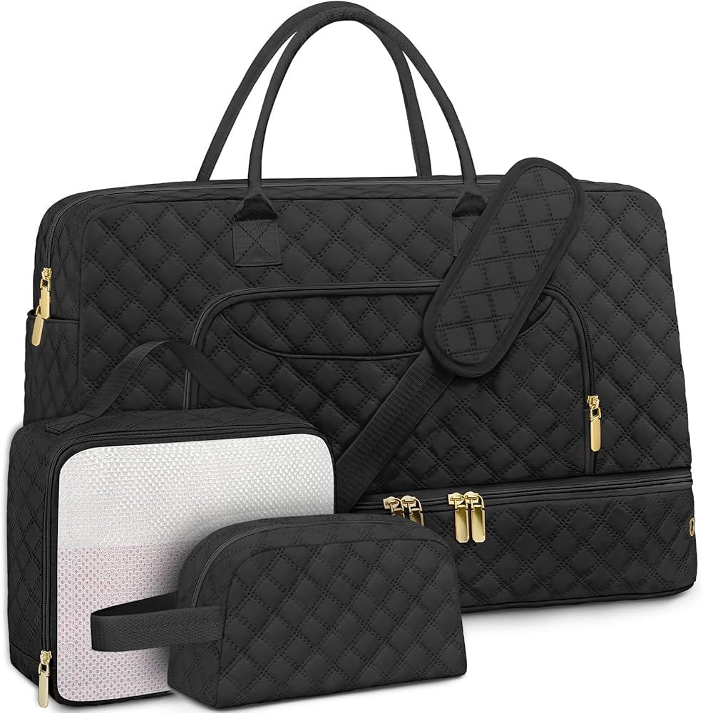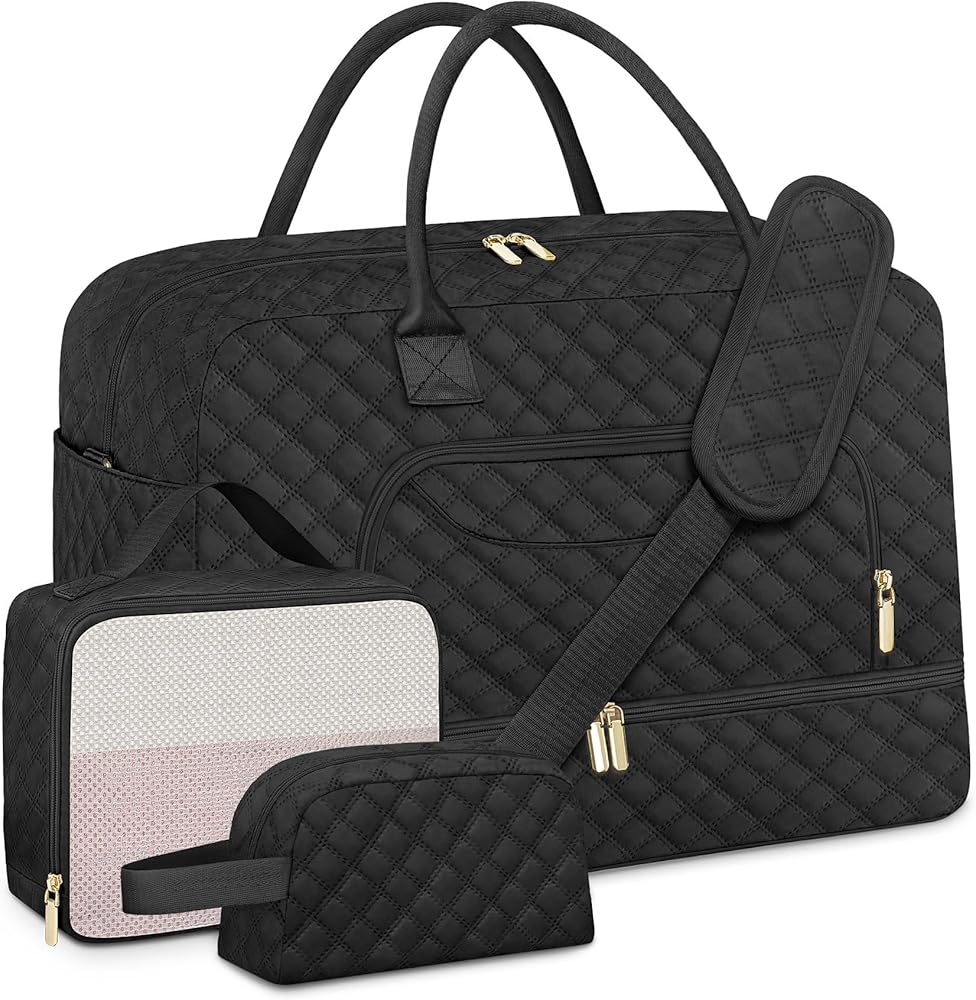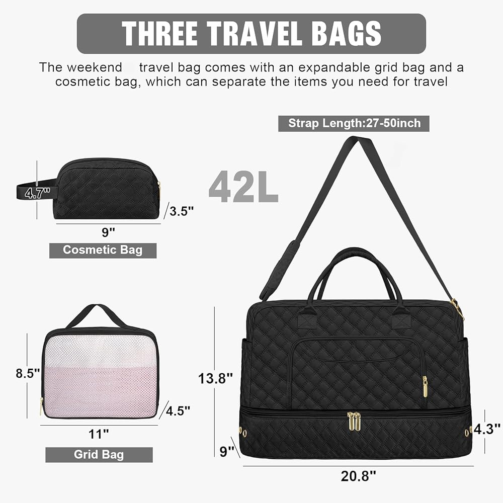 3 في حقيبة سفر واحدة: تحتوي أكياس عطلة نهاية الأسبوع هذه على حقيبة صدرية 11x4.5x8.5 × 8.5 بوصة وحقيبة مستحضرات التجميل 9 × 3.5 × 5 بوصة ، مع ما مجموعه 9 جيوب و 1 مقصورة. يوفر Duffle Bag أماكن للكمبيوتر المحمول والأكواب وغيرها من العناصر ؛ يمكن أن تستوعب المساحة الفسيحة 3-5 أيام من الضروريات اليومية