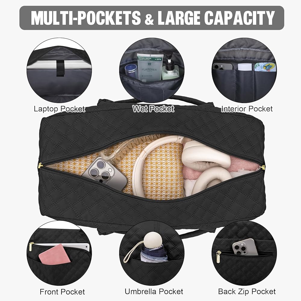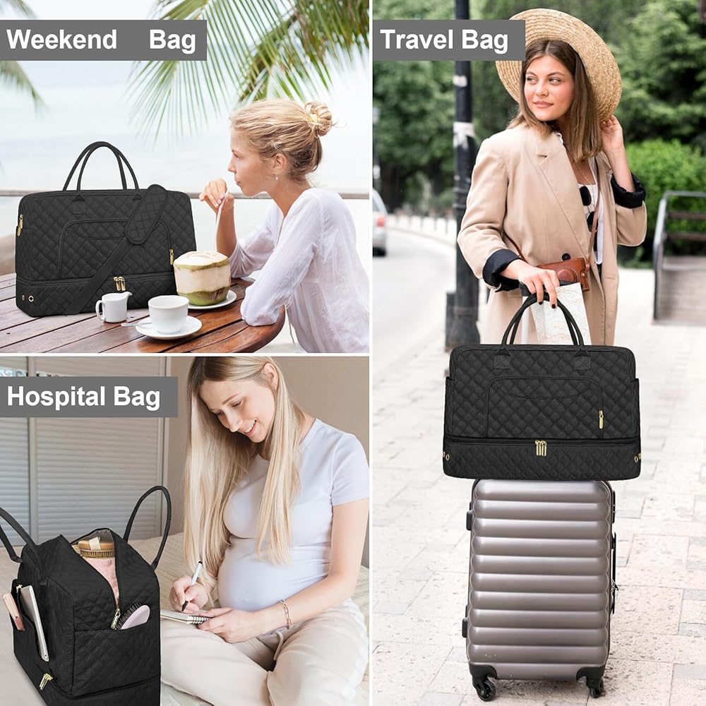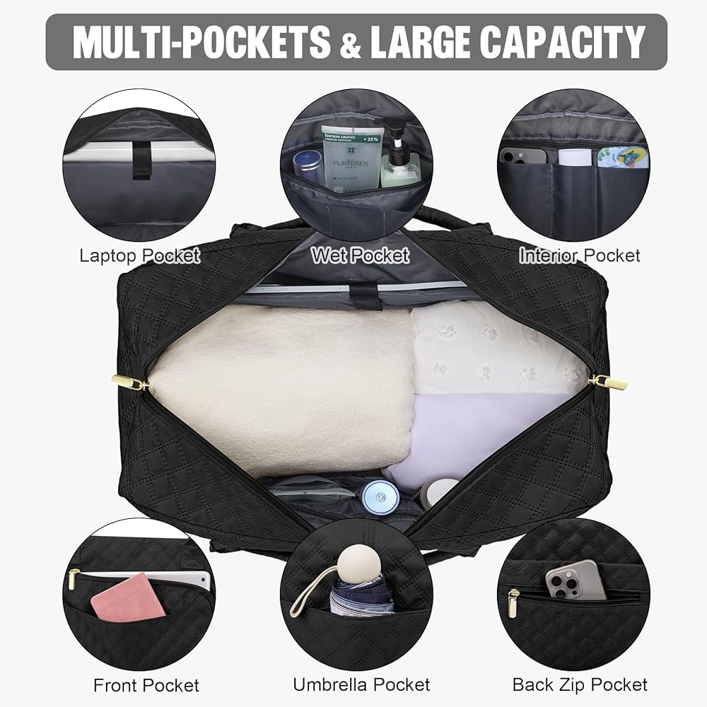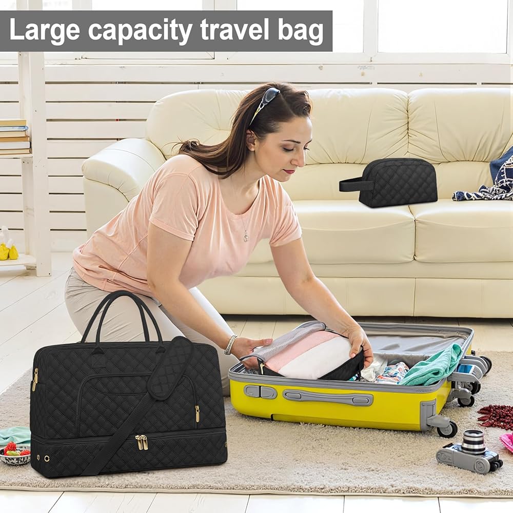 3 في حقيبة سفر واحدة: تحتوي أكياس عطلة نهاية الأسبوع هذه على حقيبة صدرية 11x4.5x8.5 × 8.5 بوصة وحقيبة مستحضرات التجميل 9 × 3.5 × 5 بوصة ، مع ما مجموعه 9 جيوب و 1 مقصورة. يوفر Duffle Bag أماكن للكمبيوتر المحمول والأكواب وغيرها من العناصر ؛ يمكن أن تستوعب المساحة الفسيحة 3-5 أيام من الضروريات اليومية