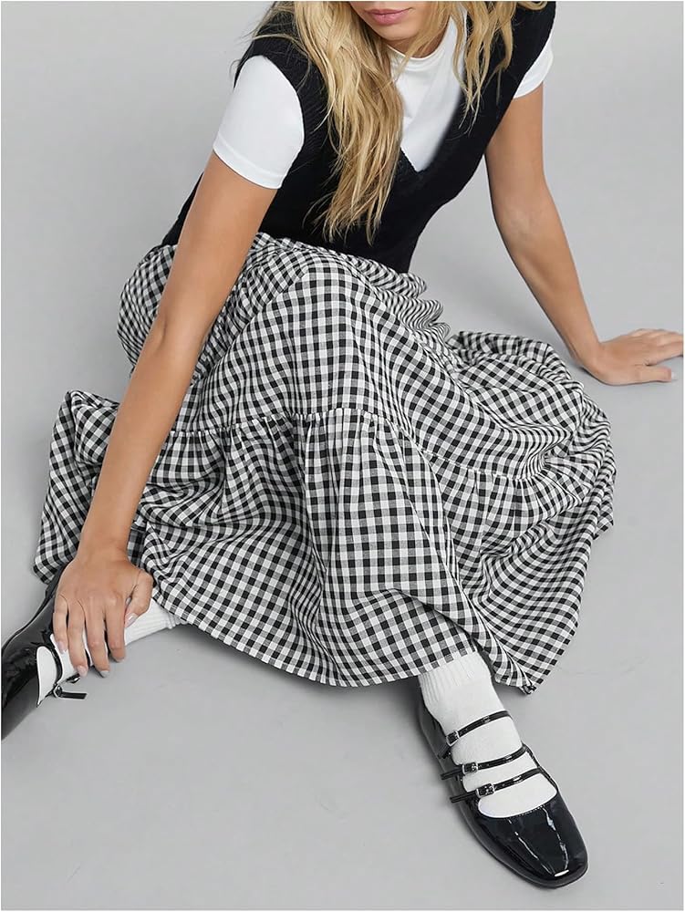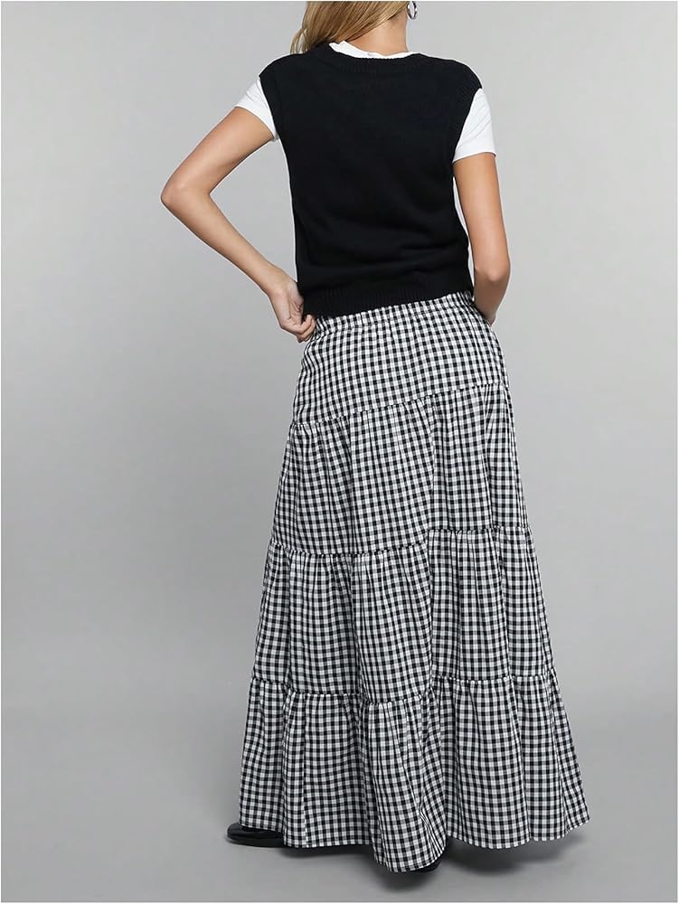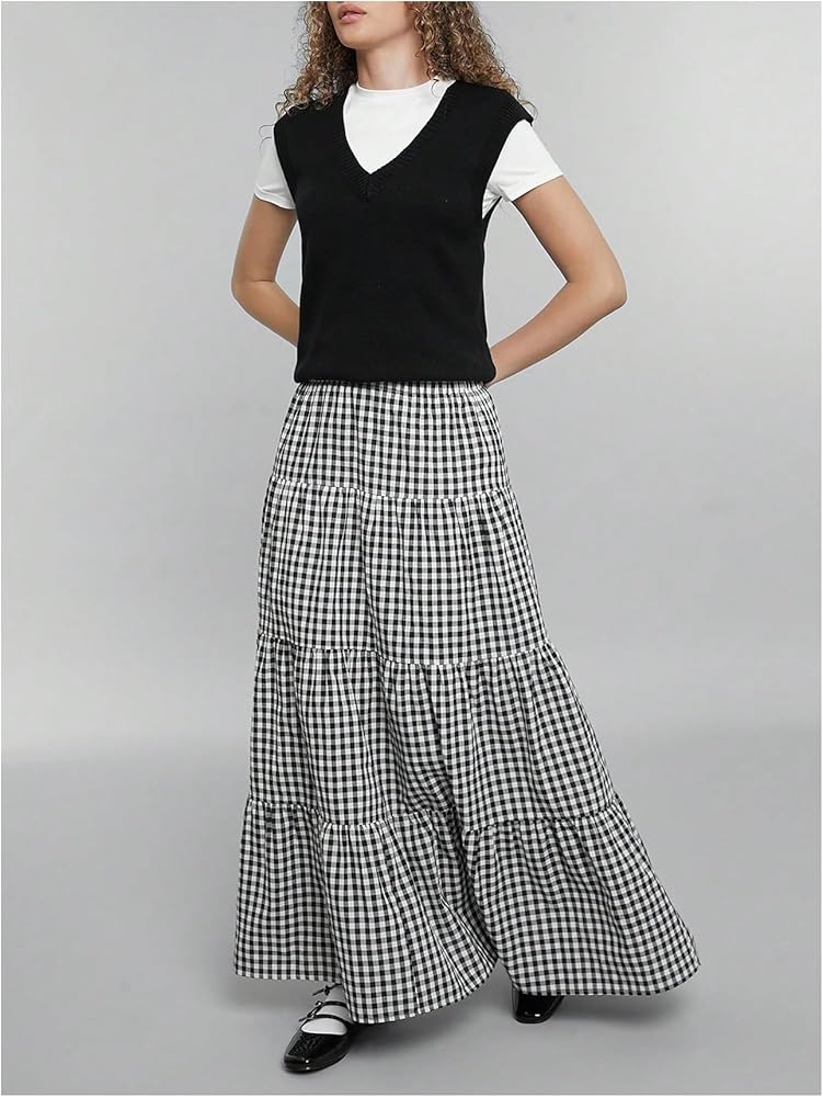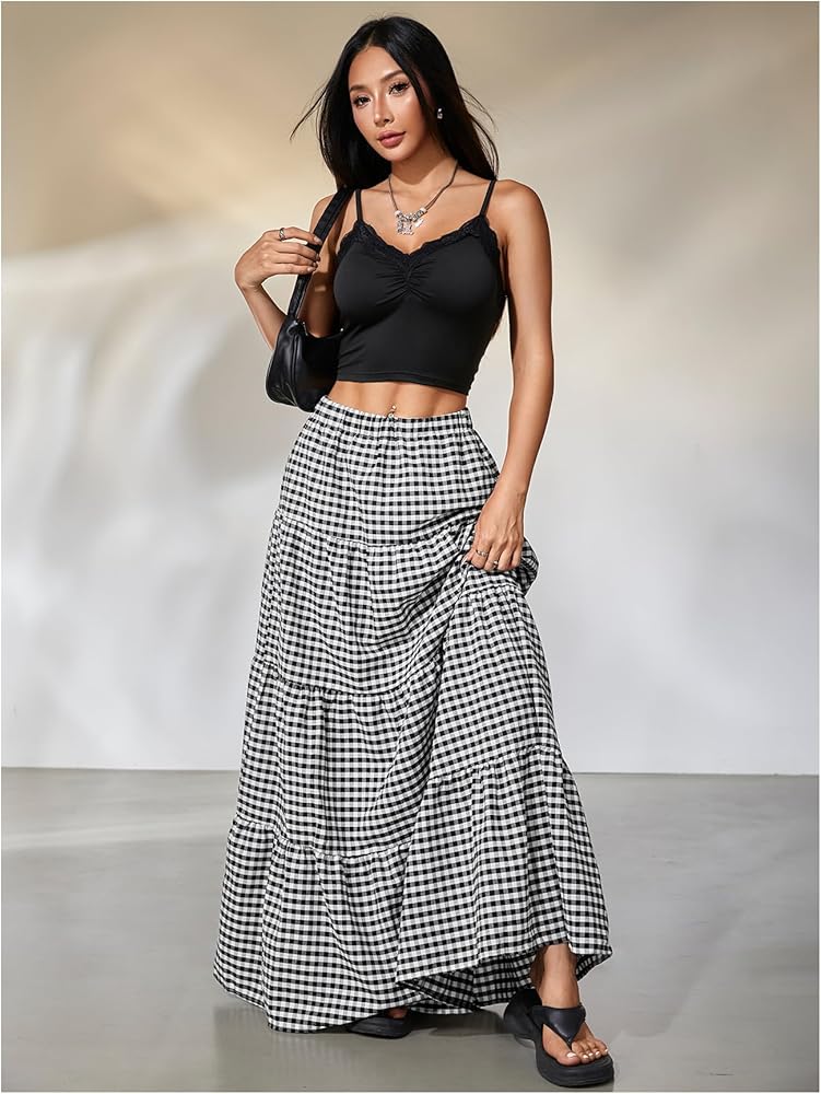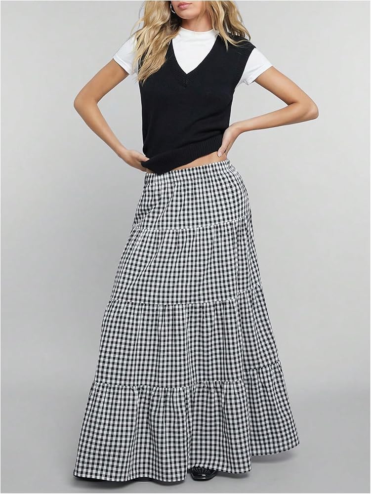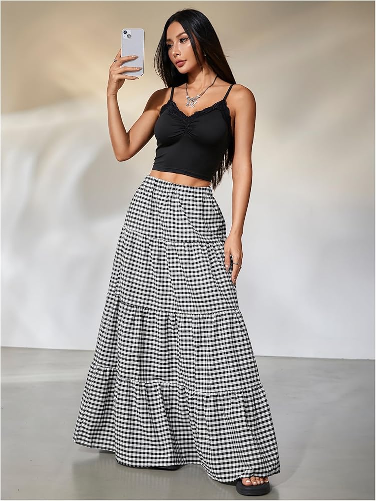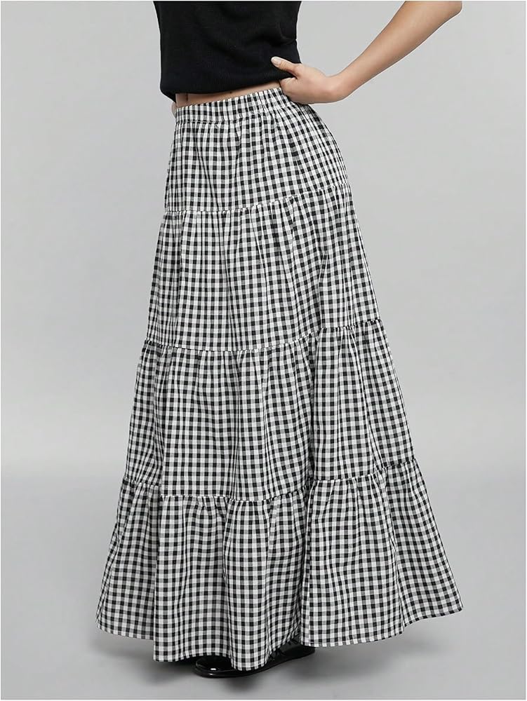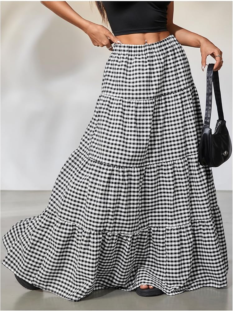 • Features: Gingham print, tiered layer, ruffle hem, loose fit, high waist, maxi, boho a line skirt