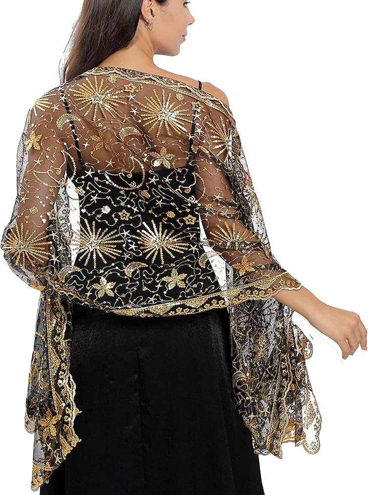 - تصميم أنيق: الحجم 23.6x74.8in (60x190cm) ، شال من الدانتيل المطلق يضم نمطًا سماويًا مذهلاً مع نجوم ذهبية وأقمار وأشعة الشمس على خلفية السوداء السوداء