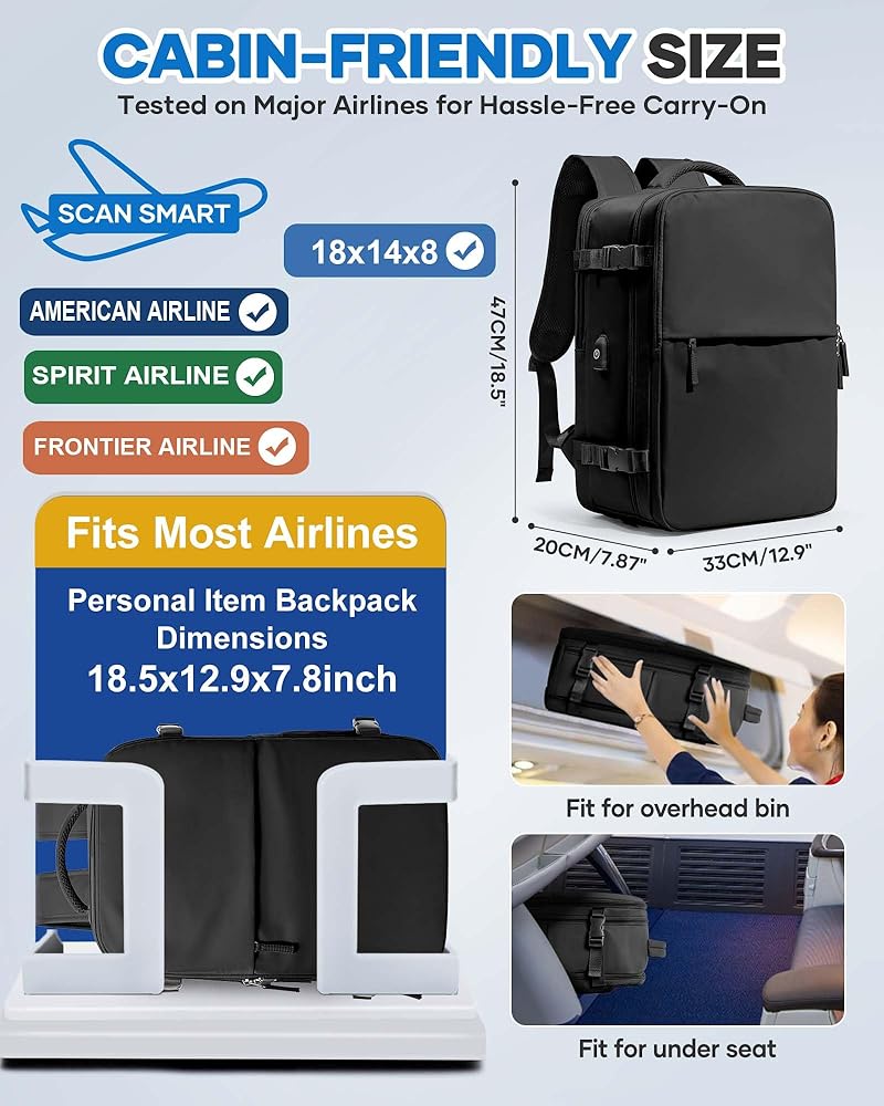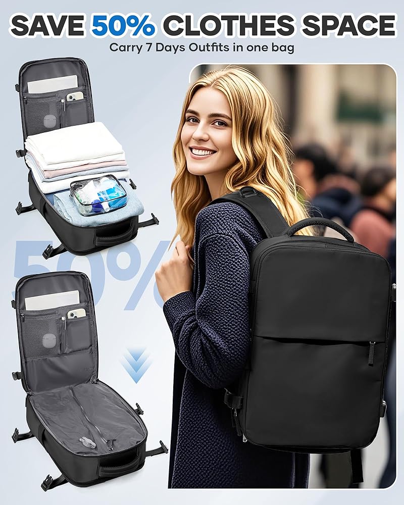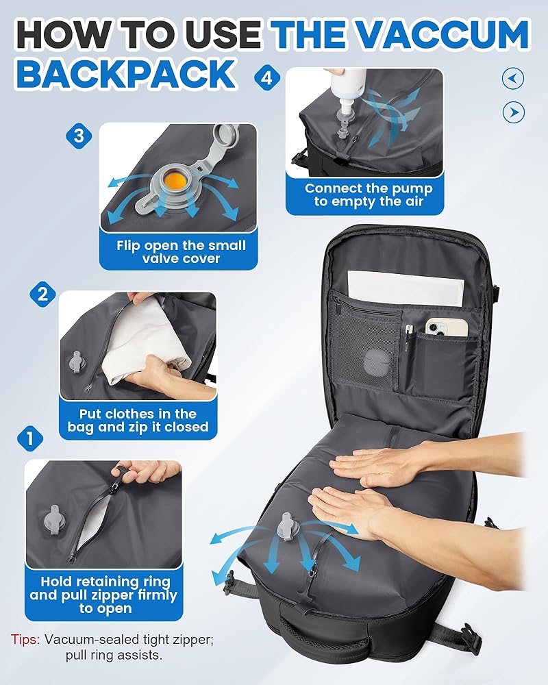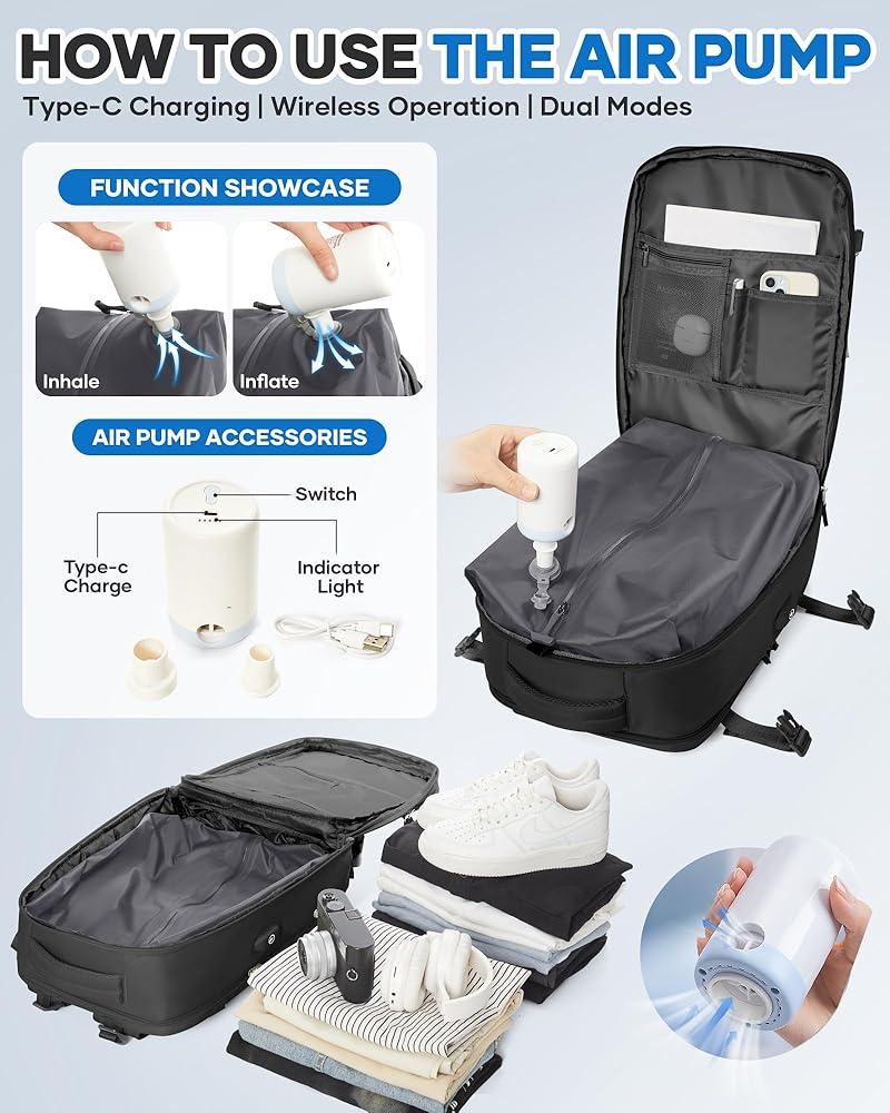 • 📣Vacuum Compression with Air Pump - This Vacuum Backpack features vacuum compression technology with AirPump.Simply attach and press to instantly compress multiple items of clothing, saving up to 50% space in seconds. The airtight seal keeps items compact for days, perfect for short-term business trips or traveling.