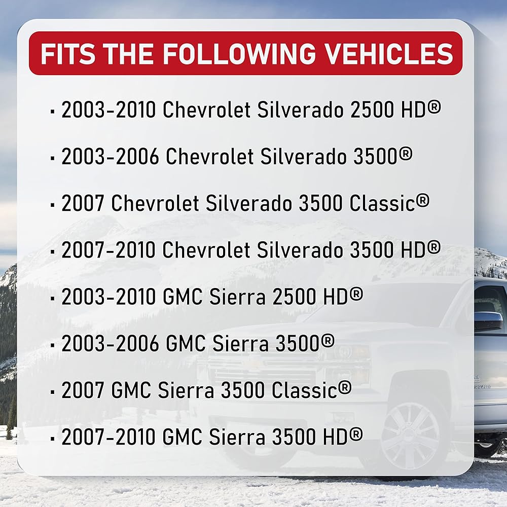 Compatible Replacement for Chevrolet & GMC - 2003 - 2010 Silverado 2500 HD | 2003 - 2006 Silverado 3500 | 2007 Silverado 3500 Classic | 2007 - 2010 Silverado 3500 HD | 2003 - 2010 Sierra 2500 HD | 2003 - 2006 Sierra 3500 | 2007 Sierra 3500 Classic | 2007 - 2010 Sierra 3500 HD |.