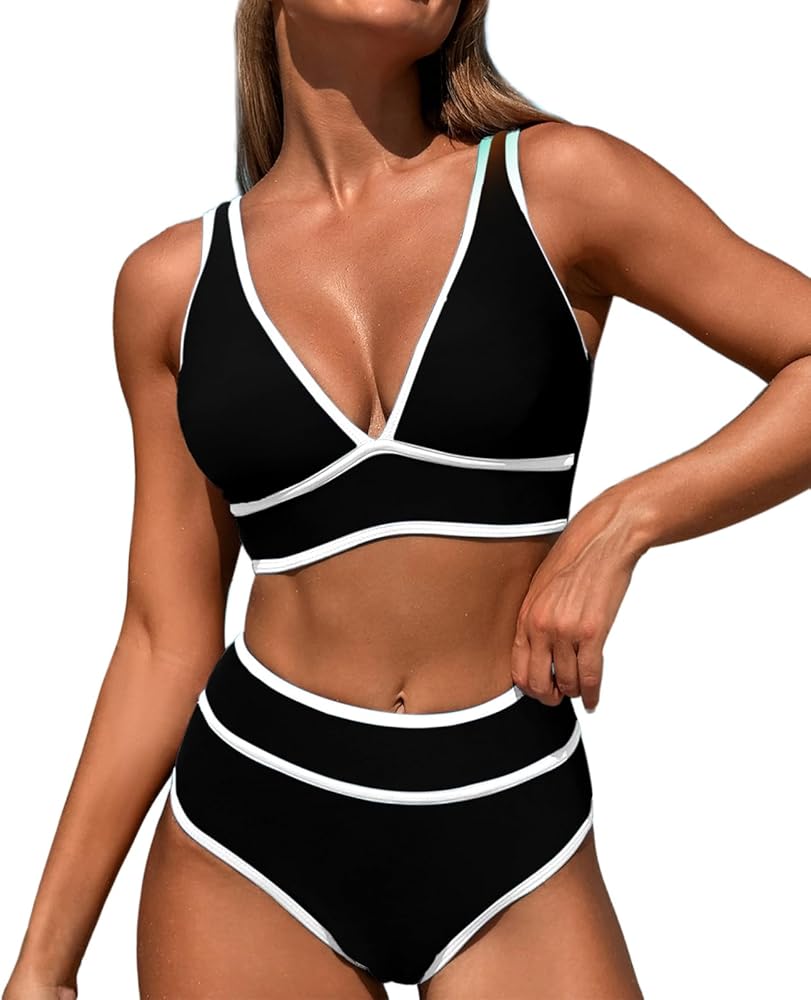• قطعتين للسباحة للنساء: V-Neck Bikini Top. ارتفاع الخصر بيكيني القاع. مع أكواب مبطنة قابلة للإزالة. يلعب قاع البيكيني المرتفع الخفي مع تغطية كافية دورًا للتحكم في البطن بينما أظهر جسمك الساحر وساقيك المطول.