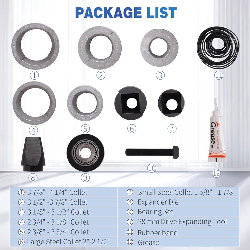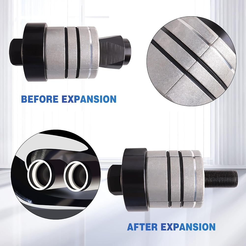 Choose the proper collet, clamp the pipe, and then expand the pipe. 28mm size bolt head drives the tool and collet sets to expand pipes from 1-5/8" to 4-1/4".