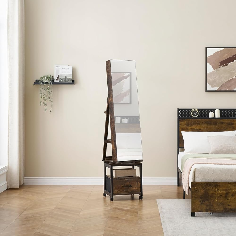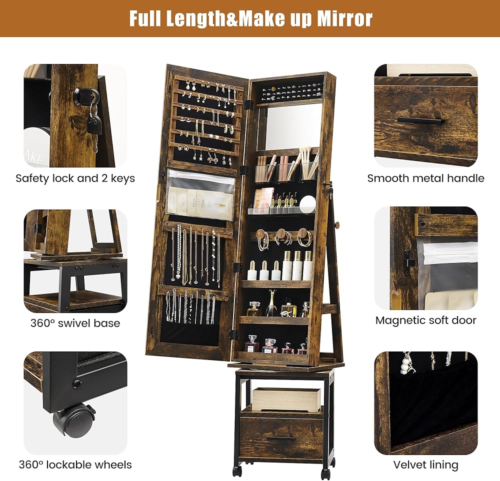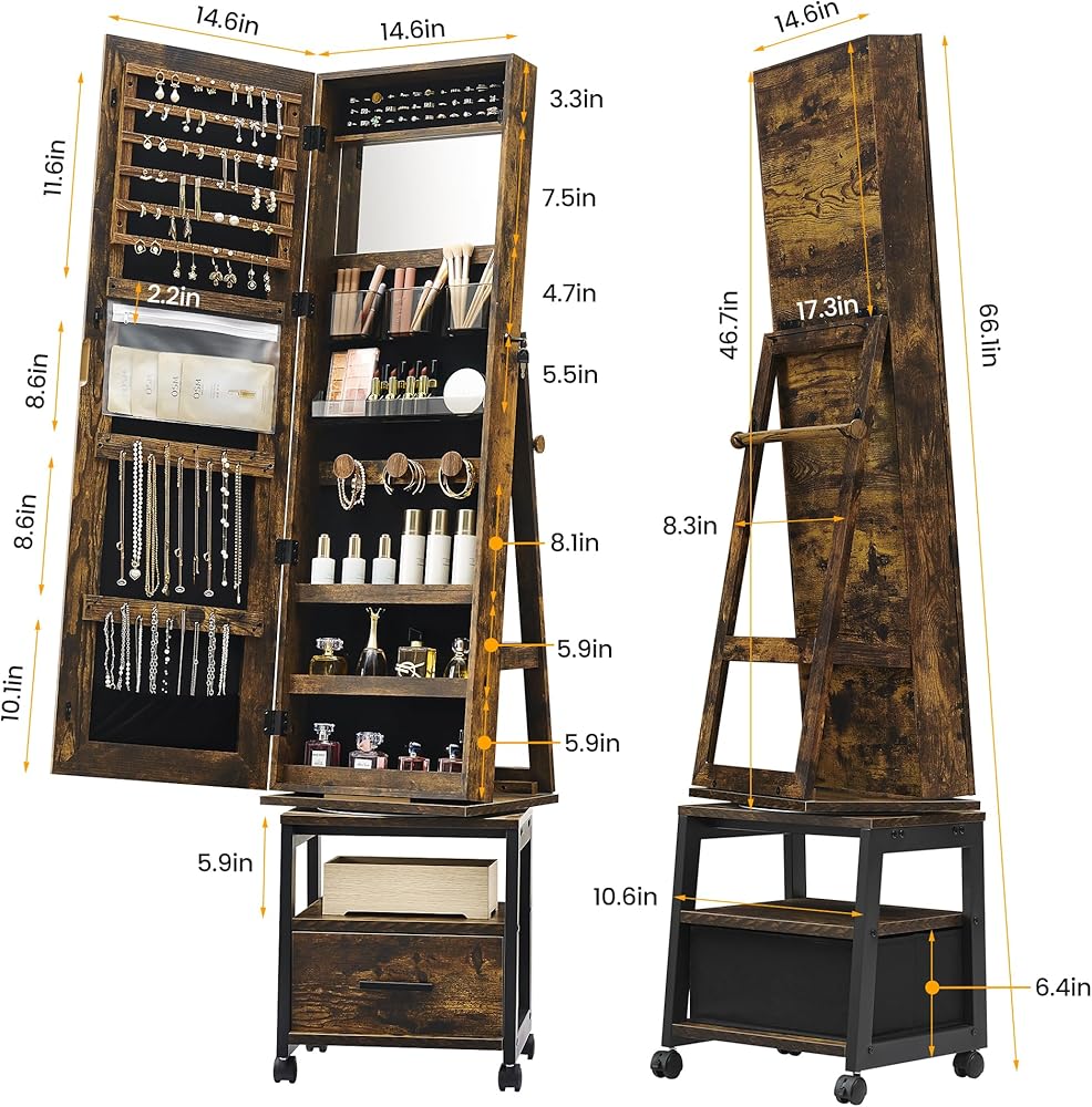 360 درجة مجوهرات دوارة armoire مع رف وأدراج تخزين ، 66 "H المجوهرات ذات الطول الكامل ARMOIRE ، خزانة مجوهرات قائمة على الأرض مع عجلات ، بني ريفي