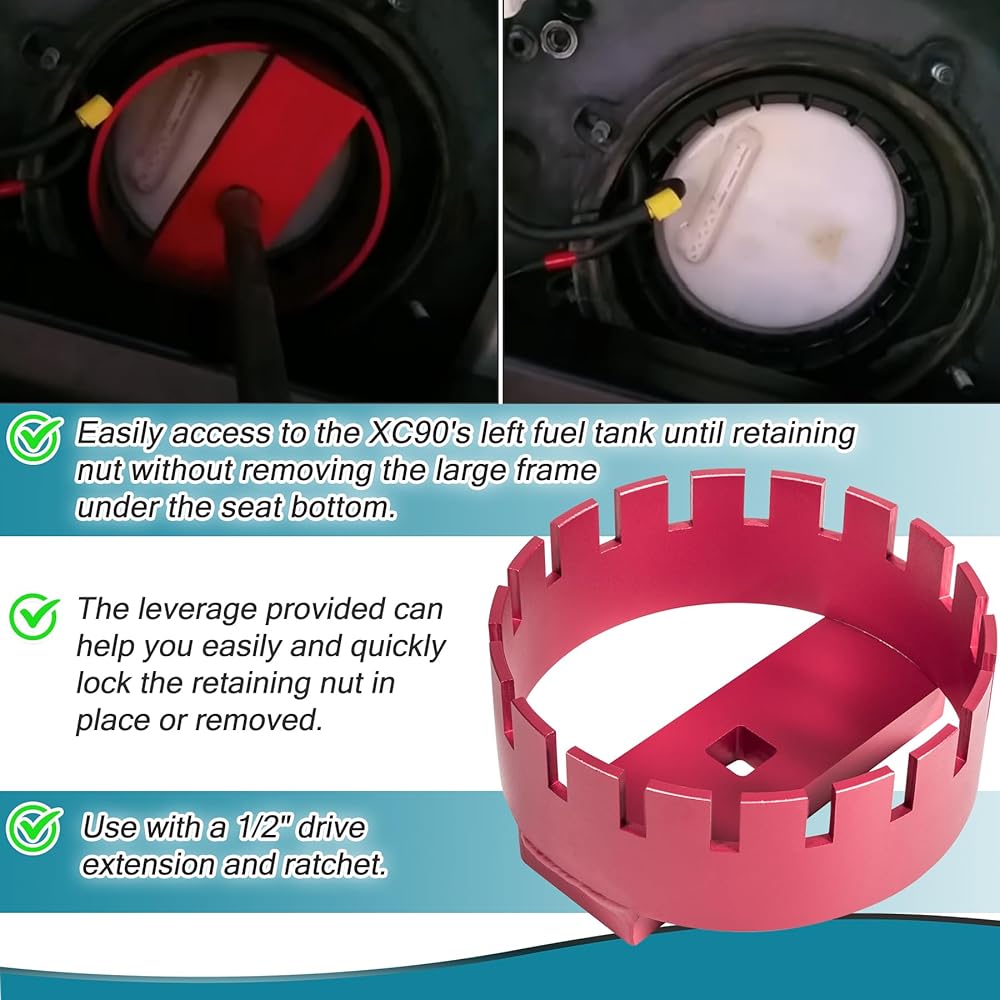 • FUNCTION: Designed to remove the left and right fuel pump retaining nuts on all latest models without dropping the fuel tank. This tool can also be used to easily access to the XC90's left fuel tank until retaining nut without removing the large frame under the seat bottom, which can save technicians much time compared to using the taller factory tool