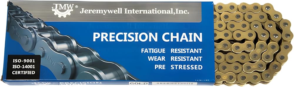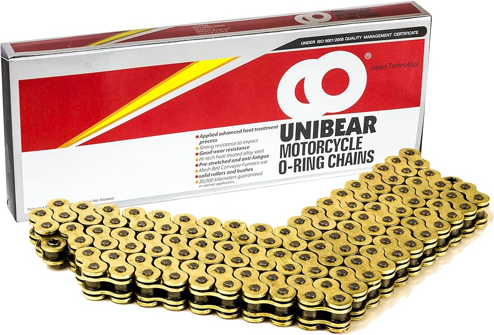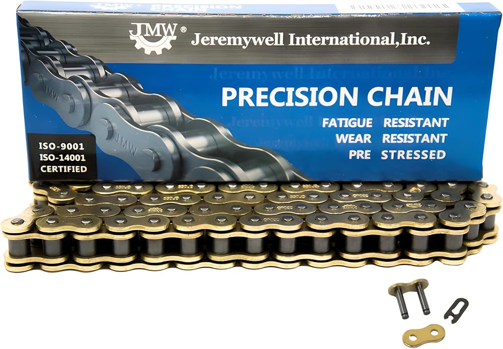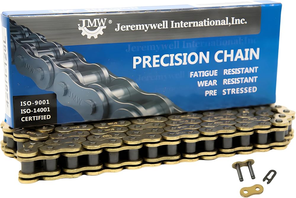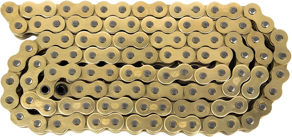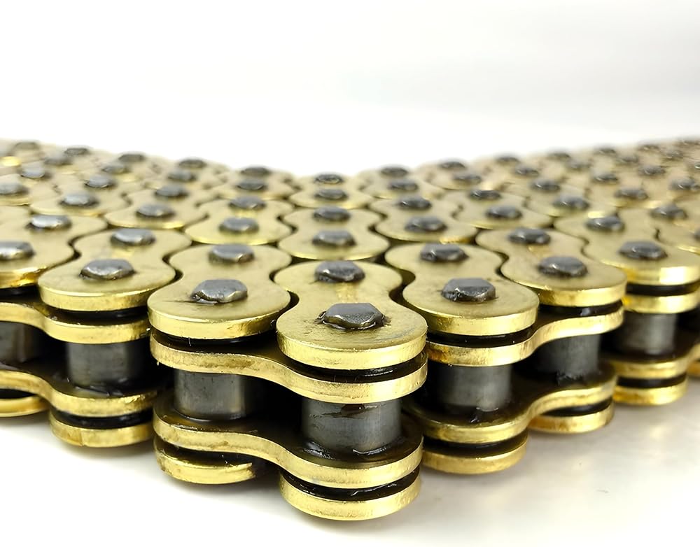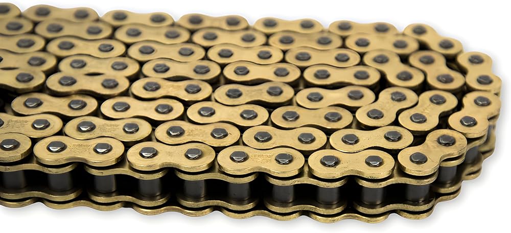 530 GOLD Motorcycle O-Ring Chain 120 Links with 1 Connecting Link-Pre-greased, no maintenance neededColor: GoldAverage Tensile Strength: 10000 lbsLength: 120 LinksMaterial: Alloy SteelPitch Size: 5/8 InchStyle: O-RingProduct Description: This O-Ring chain achieves permanent lubrication sealing between pin and bush. It has solid bushing, high quality of pin material and 4-side riveting, which ensure with longer lifetime and minimum maintenance. It is pre-stretched, anti-fatigue and has high-tech heat treated alloy steel, which enable a strong resistance to impact and good ware resistance.