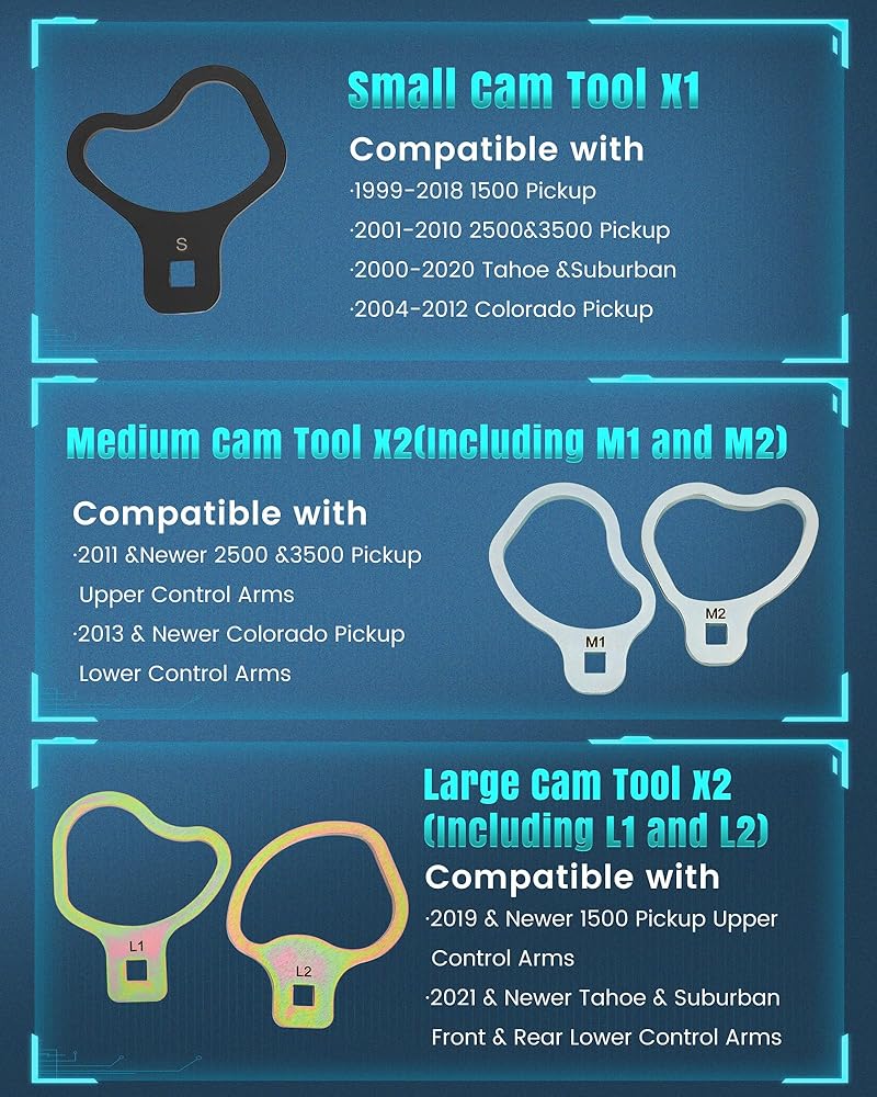 Ultimate Precision for GM Repairs: Vikua 41620 Caster Kit offers professional-grade performance, designed for Chevrolet/GMC models. Automotive-specific tools made of high-strength alloy steel ensure no slipping on rusty OE camshafts, while the extended wrench allows for easy access to the chassis, reducing adjustment time by 50%. This wheel alignment tool set is perfect for control arm tool calibration and is wear-resistant. Trusted by mechanics, it can handle even the toughest jobs with ease!
