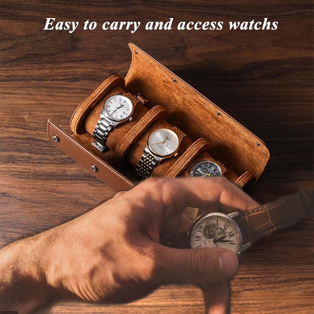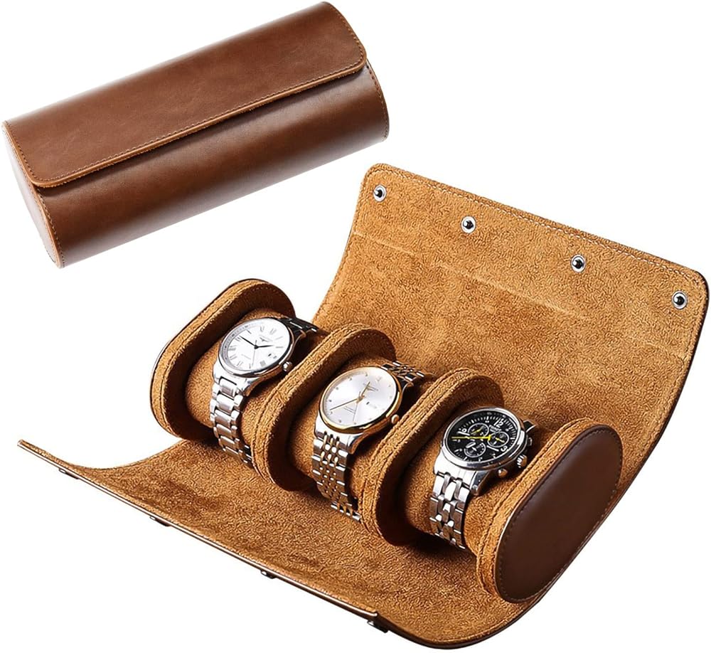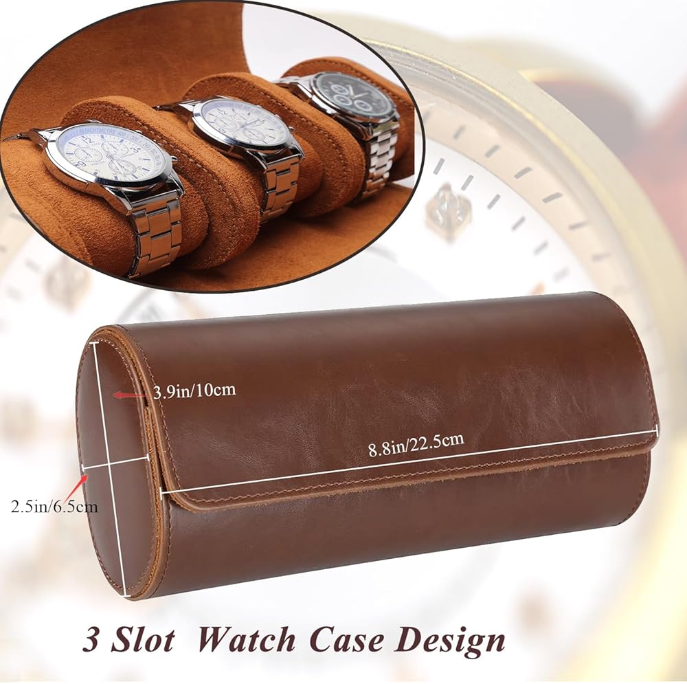 شاهد سفر سفر ، مربع منظم لفة الساعات الفاخرة ، هدايا تخزين المجوهرات للرجل والمرأة (فتحة+3 فتحة بنية)