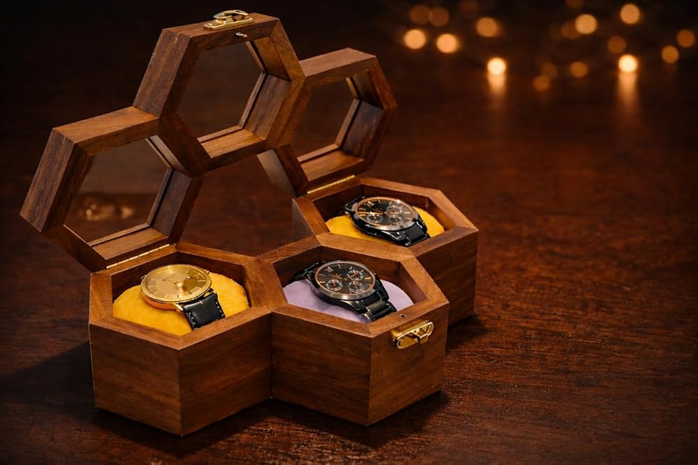 Premium Design – Made from genuine Sheesham Wood, this case offers a rich, natural grain and elegant finish, enhancing the presentation of any luxury timepiece.