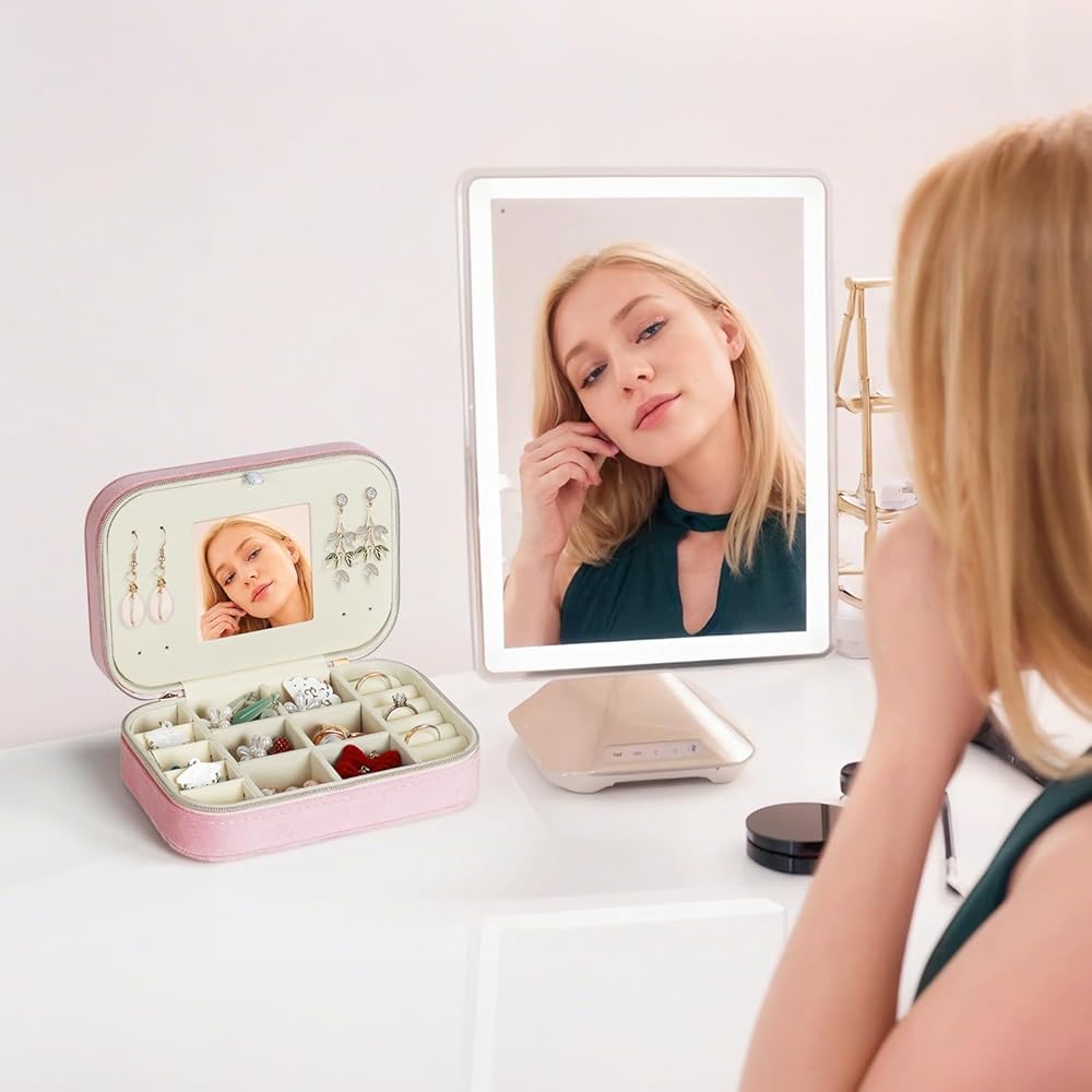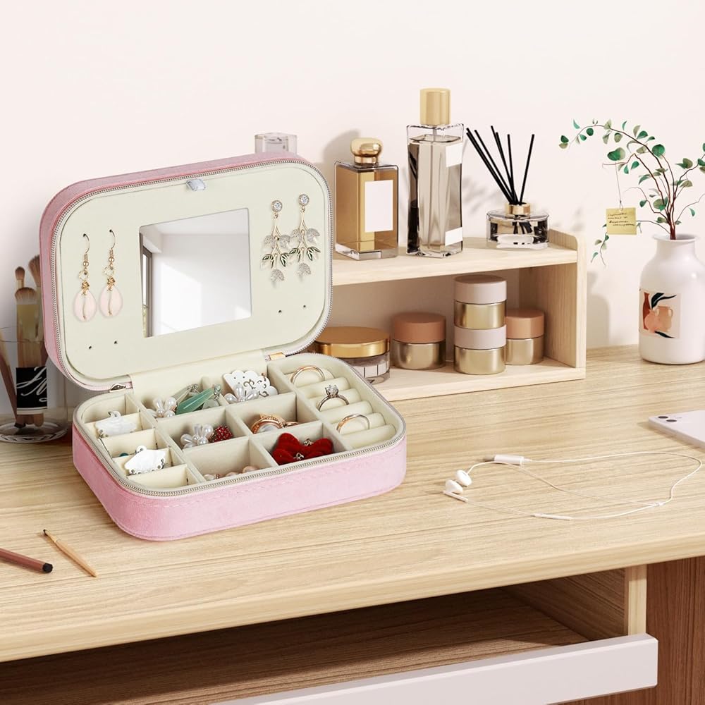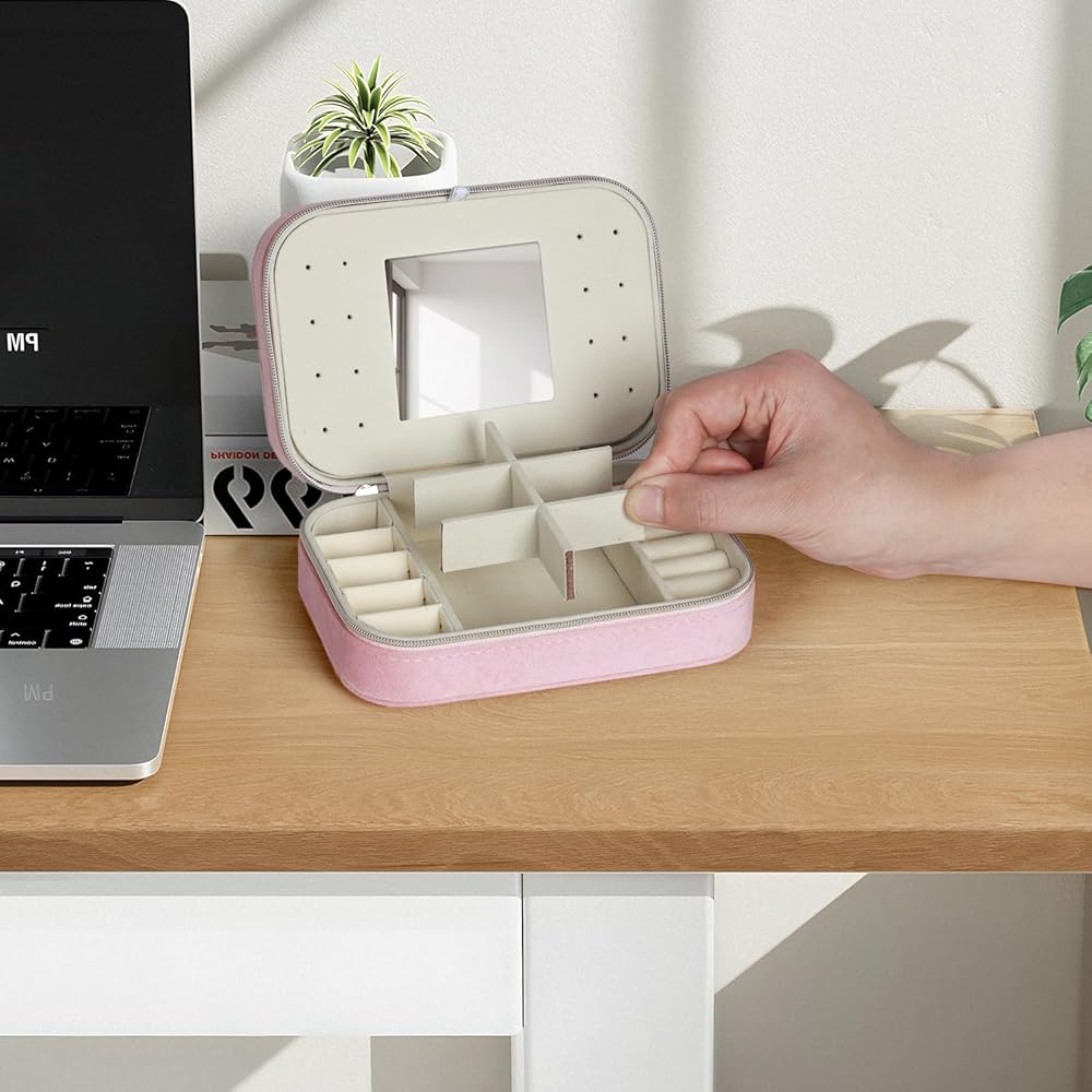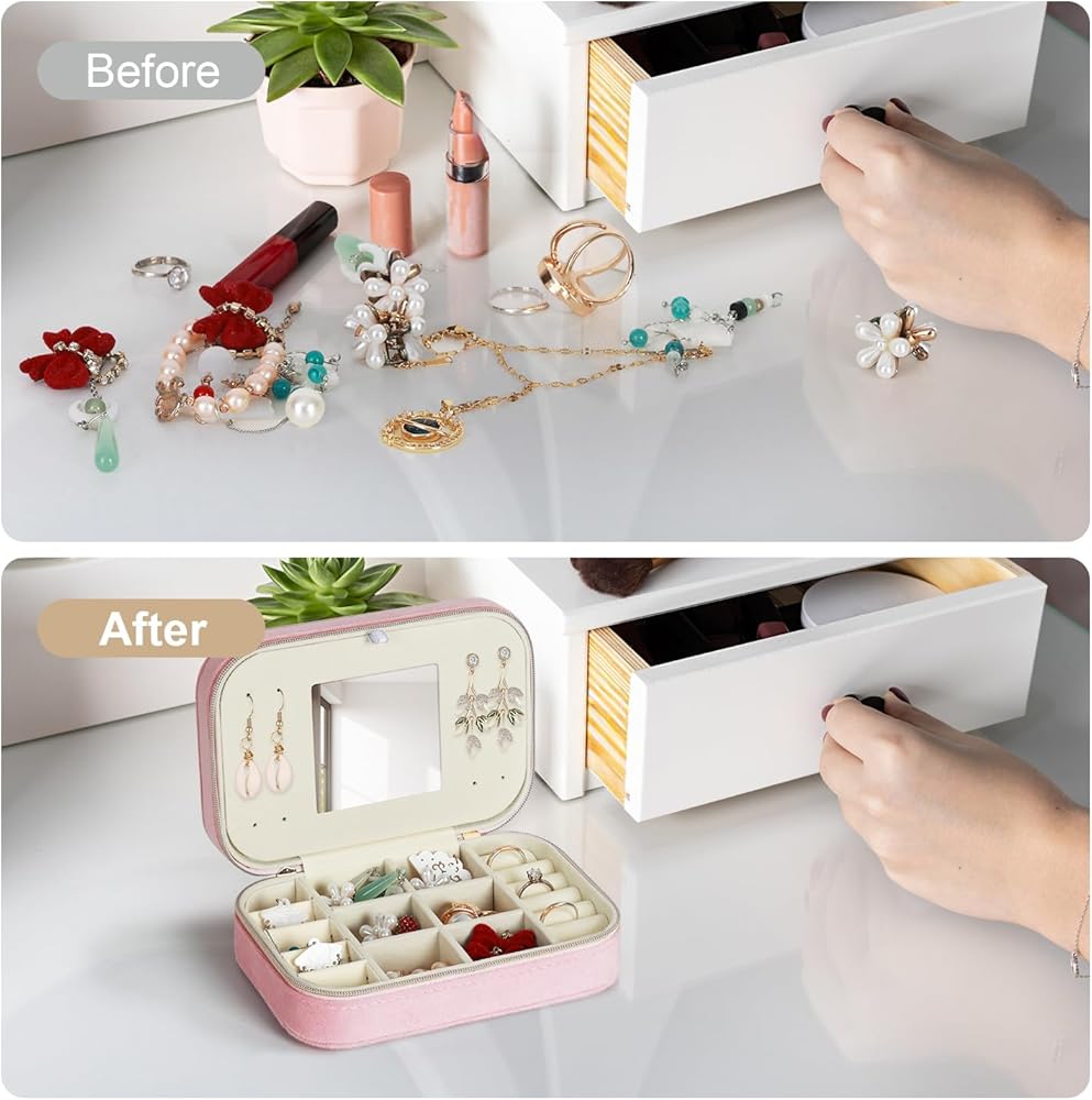 • 🎁【 تصميم فريد وبسيط】 صندوق المجوهرات المزدوج المصغر مصنوع من الفانيلا ، مقاوم للماء وسهل التنظيف. اثنين من المقصورات القابلة للإزالة لتلبية الاحتياجات المختلفة. مرآة المكياج المدمجة مريحة لك لارتداء المجوهرات ويمكن أيضًا استخدامها للمكياج. وتصميم سستة مزدوجة ، من السهل فتح وإغلاق.