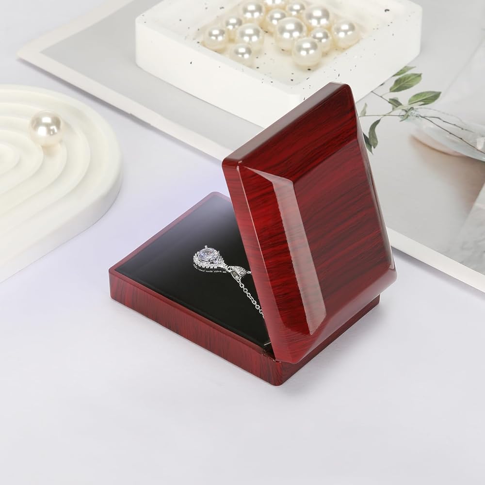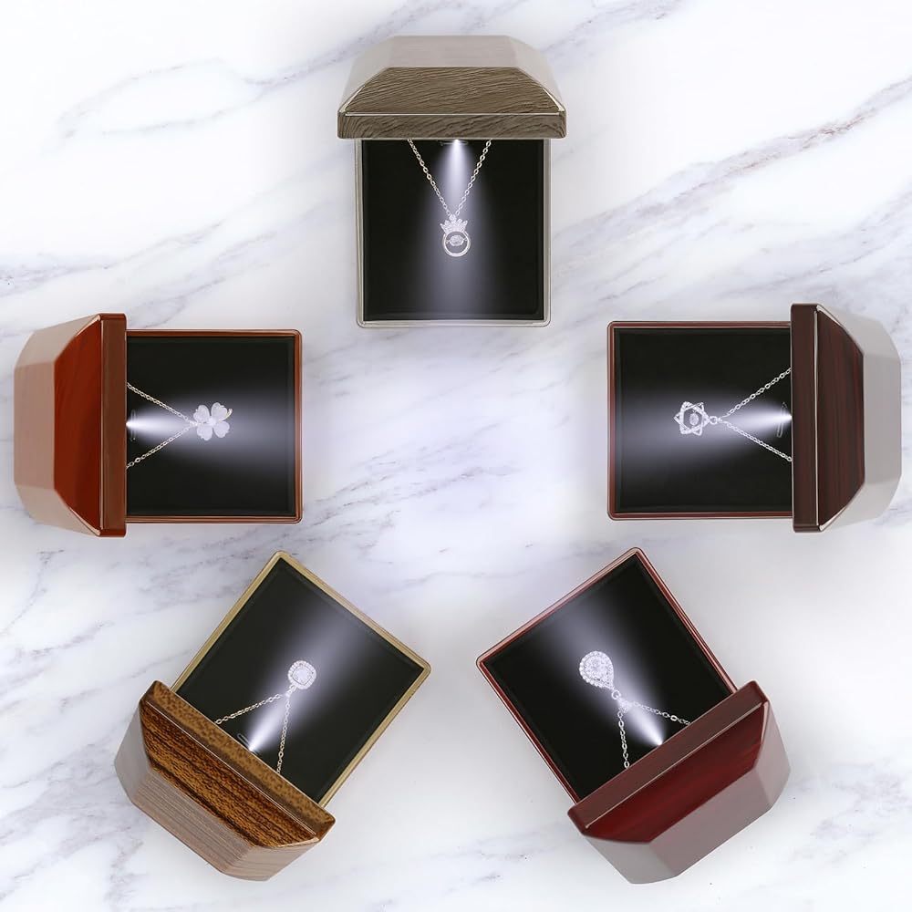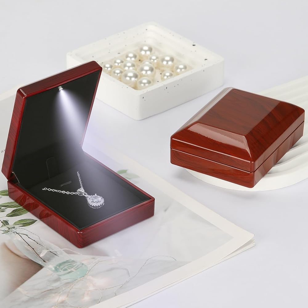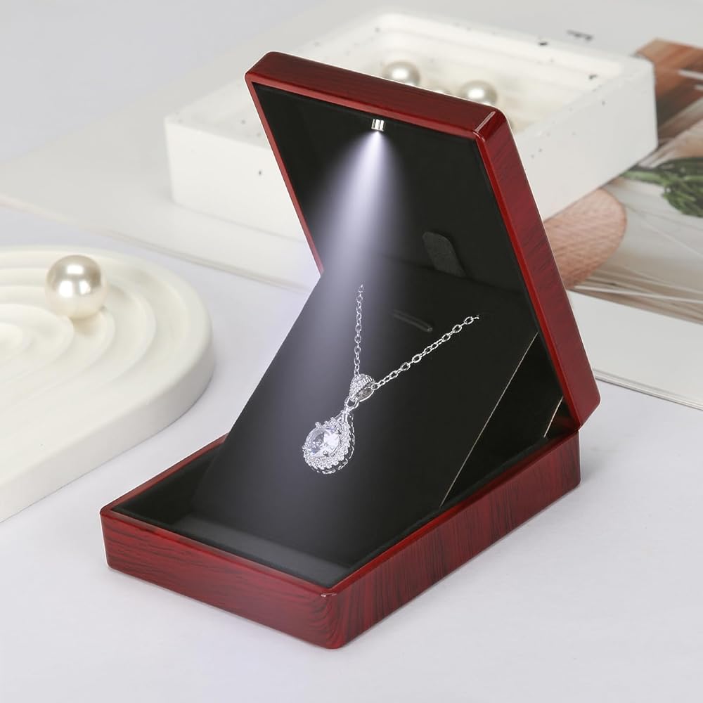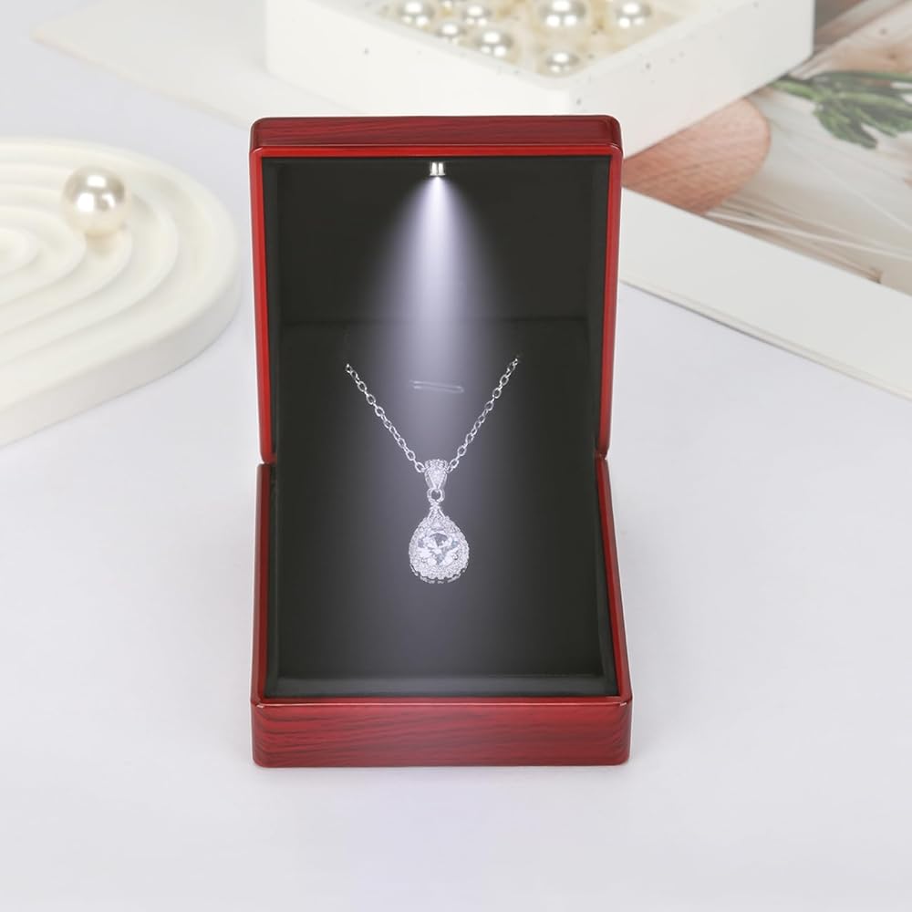 مع ضوء LED: عندما تفتح علبة القلادة ، ستضيء LED ، وسيعزز الضوء الناعم بشكل كبير بريق المجوهرات أو الماس في اللحظة الرومانسية لإحضار قلادةك إلى الحياة