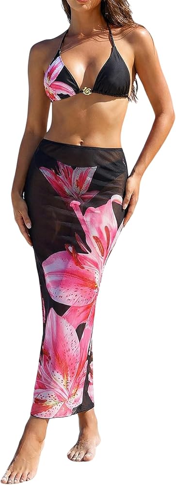 • 3 Pieces Bikini Swimsuit, Triangle Bathing Suit with Bodycon Skirt, Leopard Print, Floral Graphic, Color Block, Open Back, High Waist