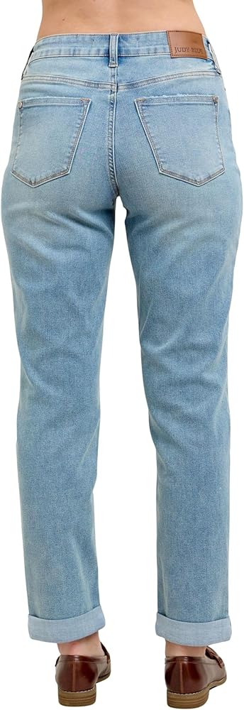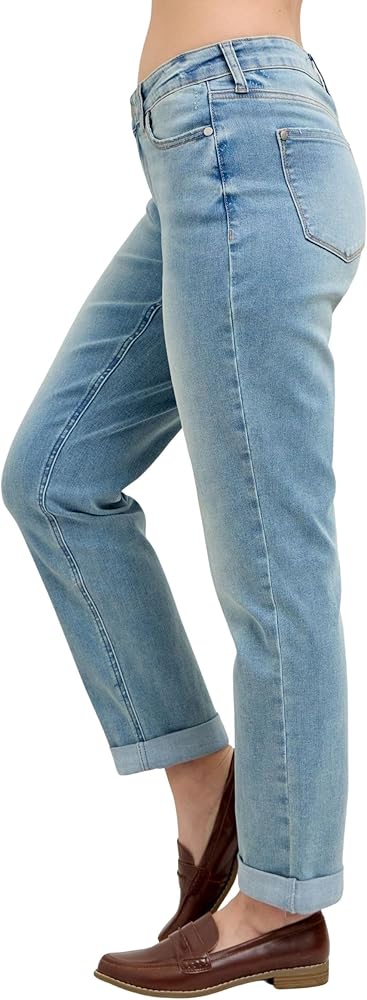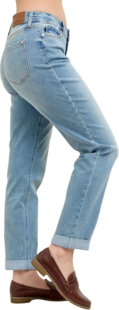 The Judy Blue Women's Mid-Rise V-Front Cool Denim Cuffed Boyfriend Jeans bring a vintage-inspired look with a modern twist. Designed with a flattering high-rise waist, these jeans offer excellent coverage and a structured yet comfortable fit. The classic straight-leg cut gives off a relaxed, effortless vibe, making them perfect for pairing with anything from a fitted tank to an oversized sweater. The light-wash denim, subtle whiskering, and faded detailing add to the retro charm, making these jeans a timeless addition to any wardrobe.