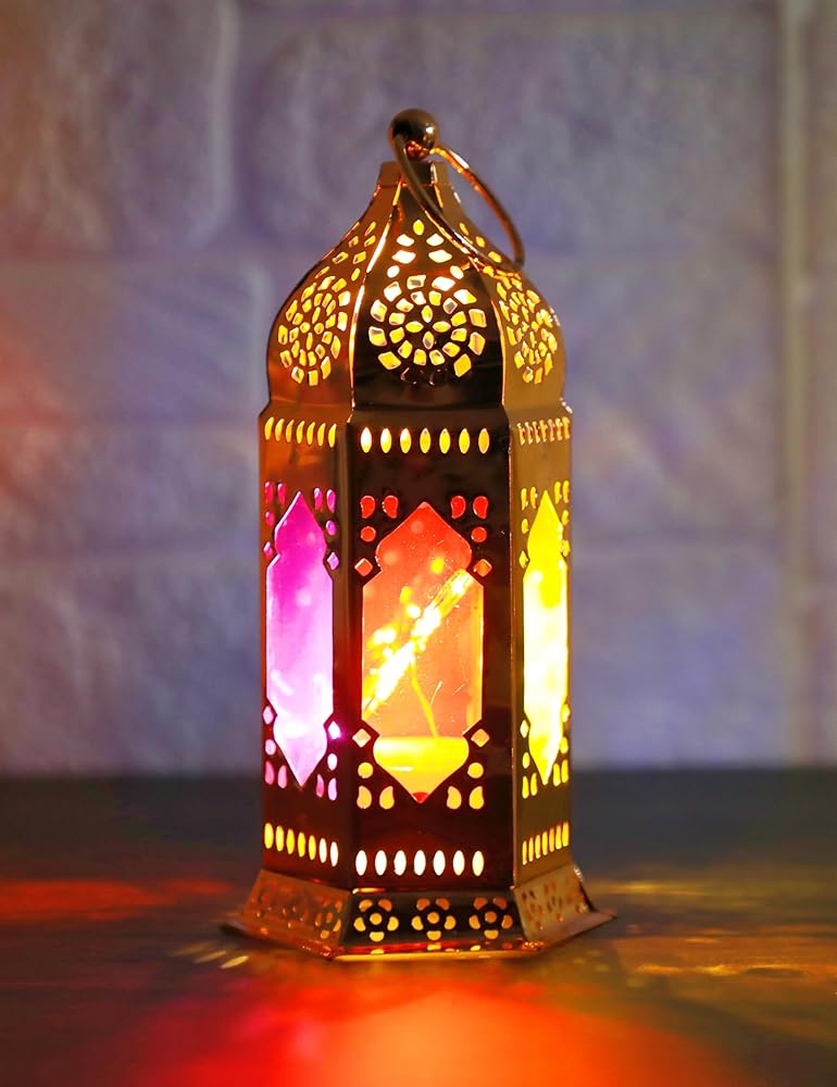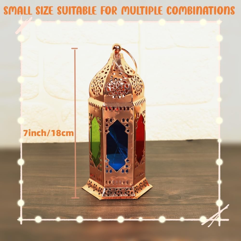 2 Pack Moroccan Style LED Candle Lantern Battery powered, Small Tealight Candle lamp with Transparent Glass Panels, 7 Inch Hanging Lantern Indoor for Ramadan Decorative Metal Lamp