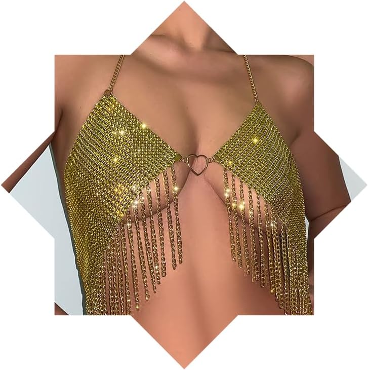 5. **Persent**: Ideal for birthdays, holidays, or any special occasion, this Gold Crystal Bra Body Chain makes a thoughtful persent for the stylish women in your life who appreciate unique fashion accessories like our rhinestone tops for women.