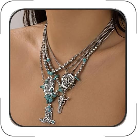 Cowgirl Accessories for Women: This cowgirl jewelry necklace set features a layered chain design with turquoise accents, a cowgirl hat pendant, and boot charms for a trendy western-inspired look