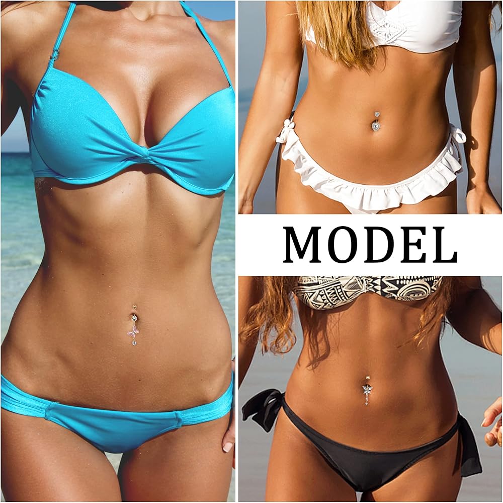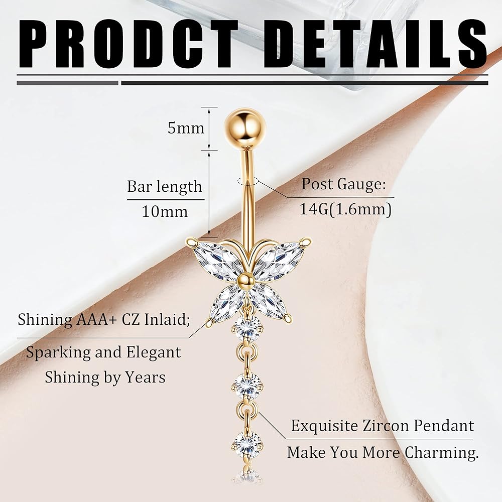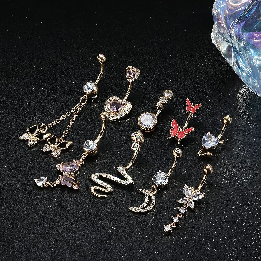 Ten Miro 14g Dangle Belly Button Rings - Snake ، Evil Eye ، Heart & Cz Bink Butterfly Dings - 316L Steeld Steel Belly Jewelry (Pink Butterfly -Gold)