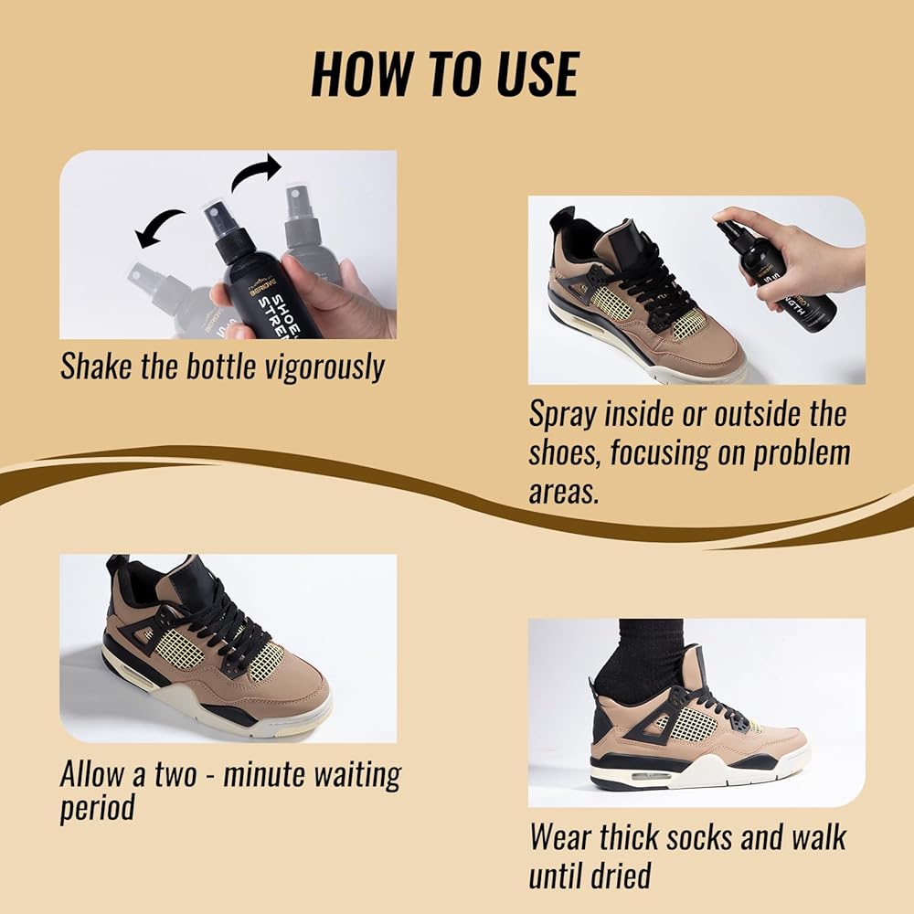 How to Use: Shake well before use and spray the inside surface of the area that needs stretching. Wait 1-2 minutes for the liquid to absorb in the material. If you're not using a shoe stretching device, wear the shoe immediately after spraying until it dries. If using a shoe stretcher, insert the stretcher into the shoe immediately after spraying.