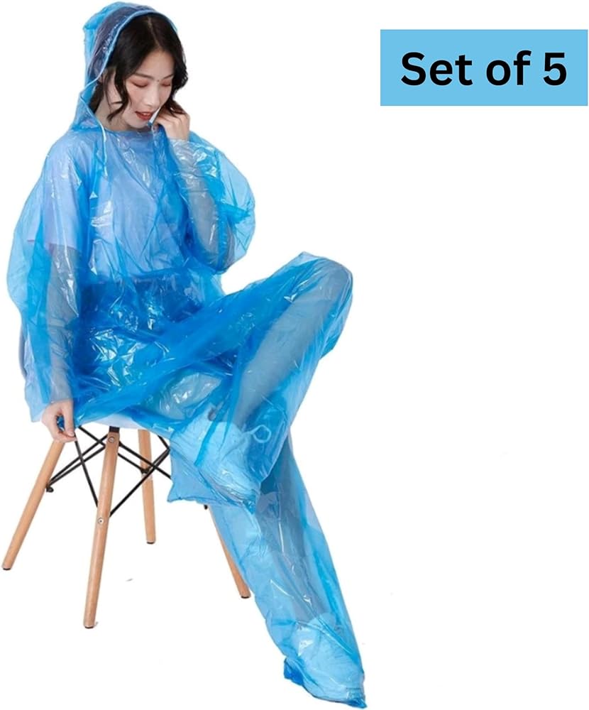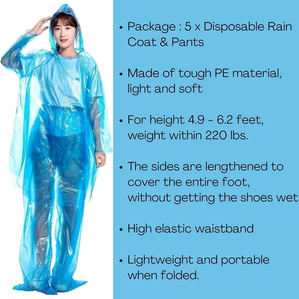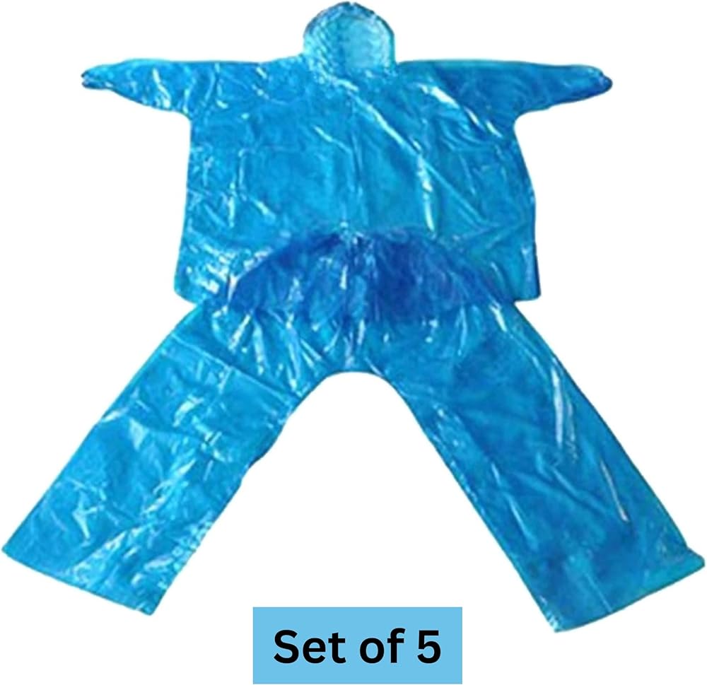 PACKAGE: 5 Set of disposable rain coats and pants.