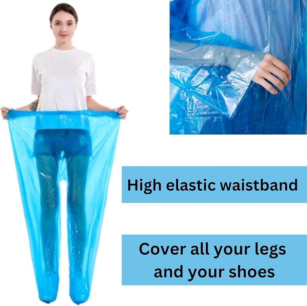 Each set includes a hooded poncho that keeps your hair dry and a full-length pant that protects your shoes. Crafted from durable, yet lightweight plastic, our rain gear is designed to be comfortable and flexible, accommodating a wide range of body types and heights from 4.9 to 6.2 feet. The elastic waistband ensures a snug fit, while the clear design offers excellent visibility. Whether you're a man or a woman, our one-size-fits-most raincoats are perfect for anyone under 220 pounds. Say goodbye to soggy clothes and hello to worry-free rainy days!