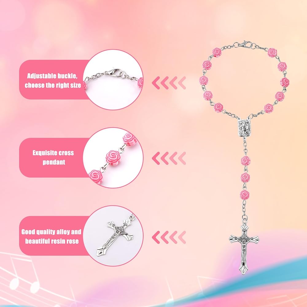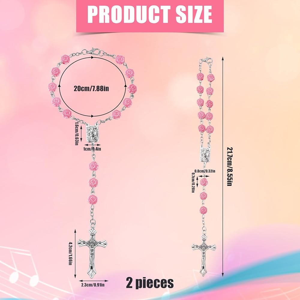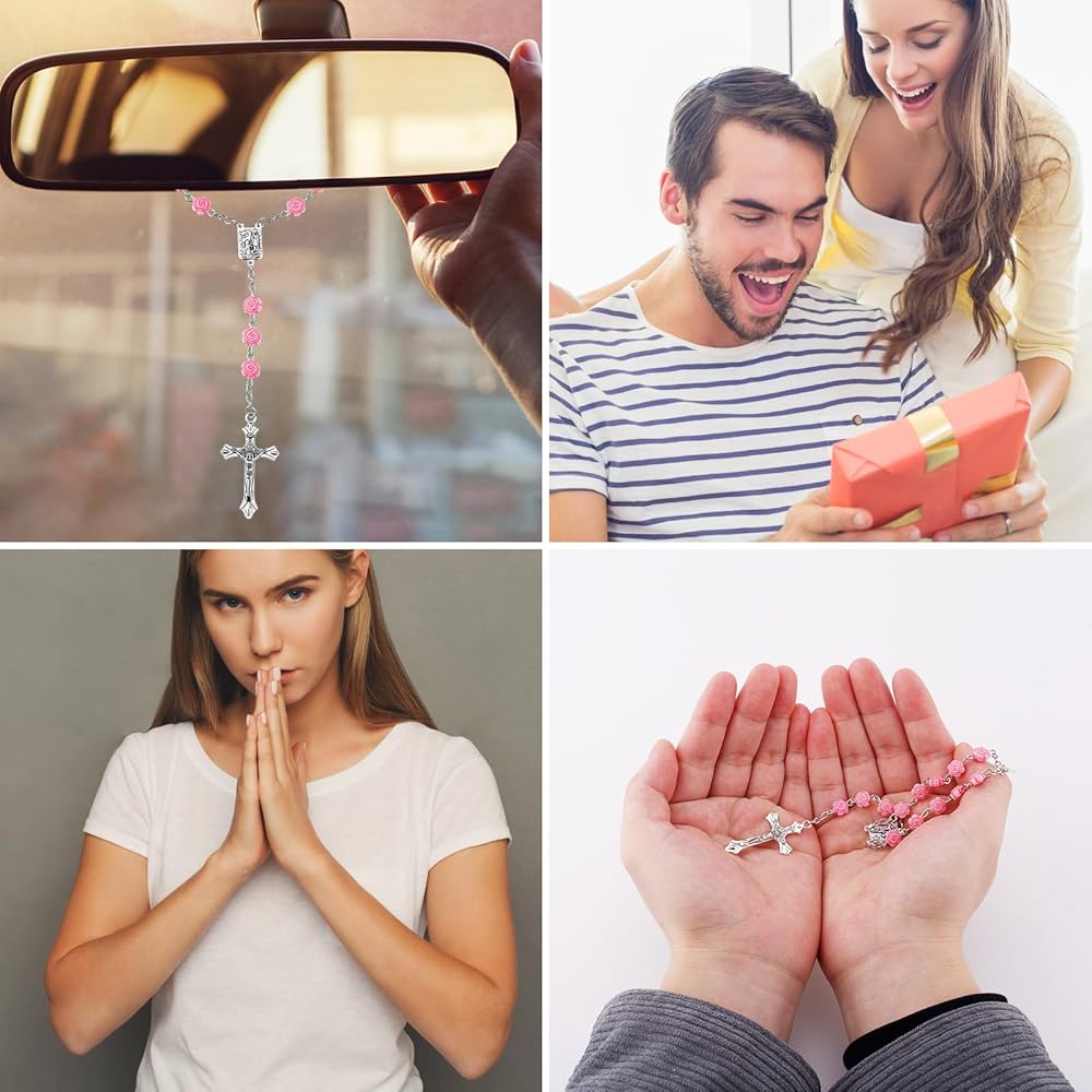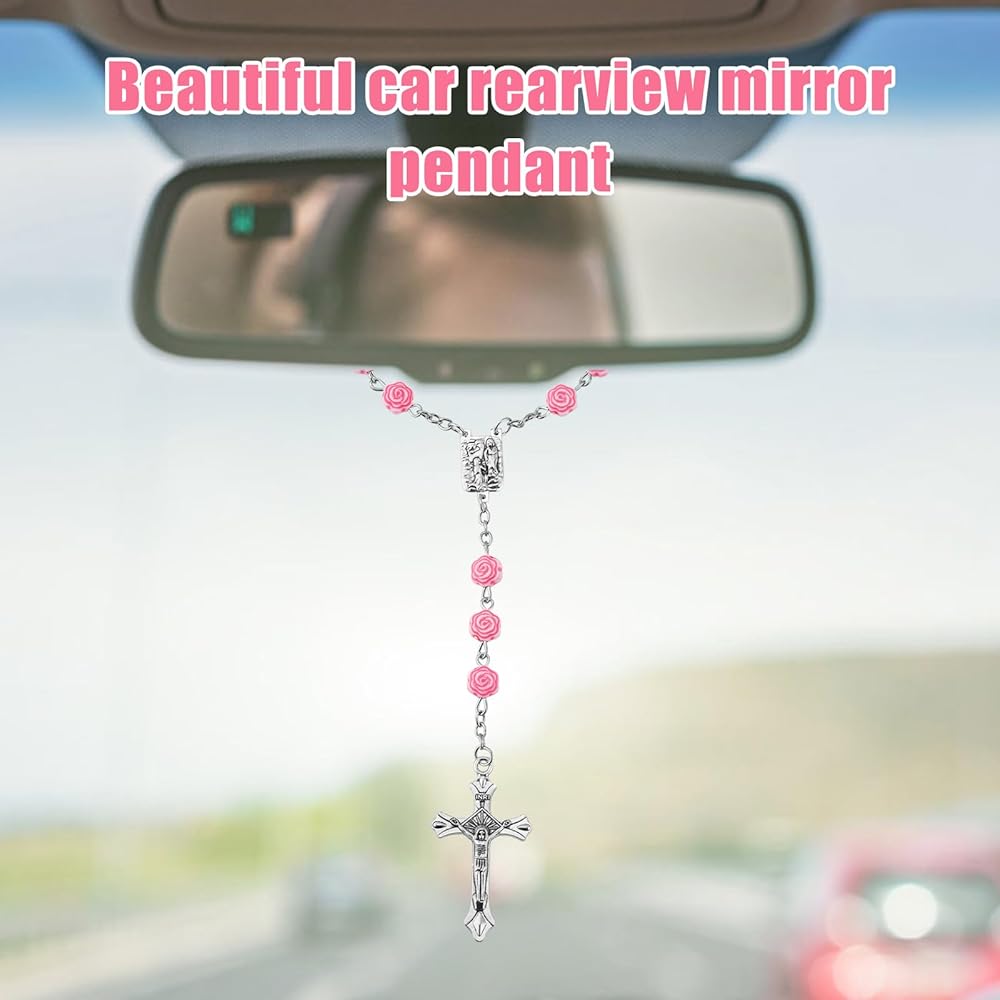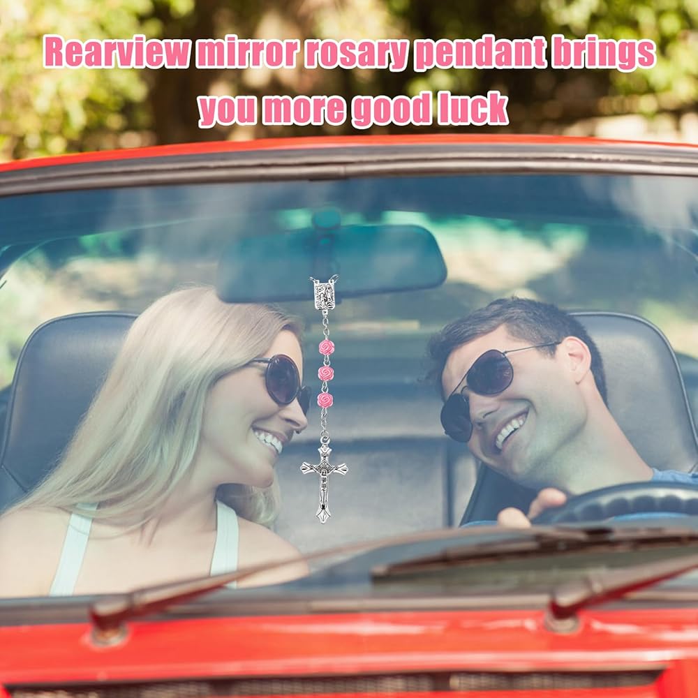 Stylish Car Decor: The rosaries feature soft pink beads and a delicate cross pendant, perfect for women who like fashionable car accessories.