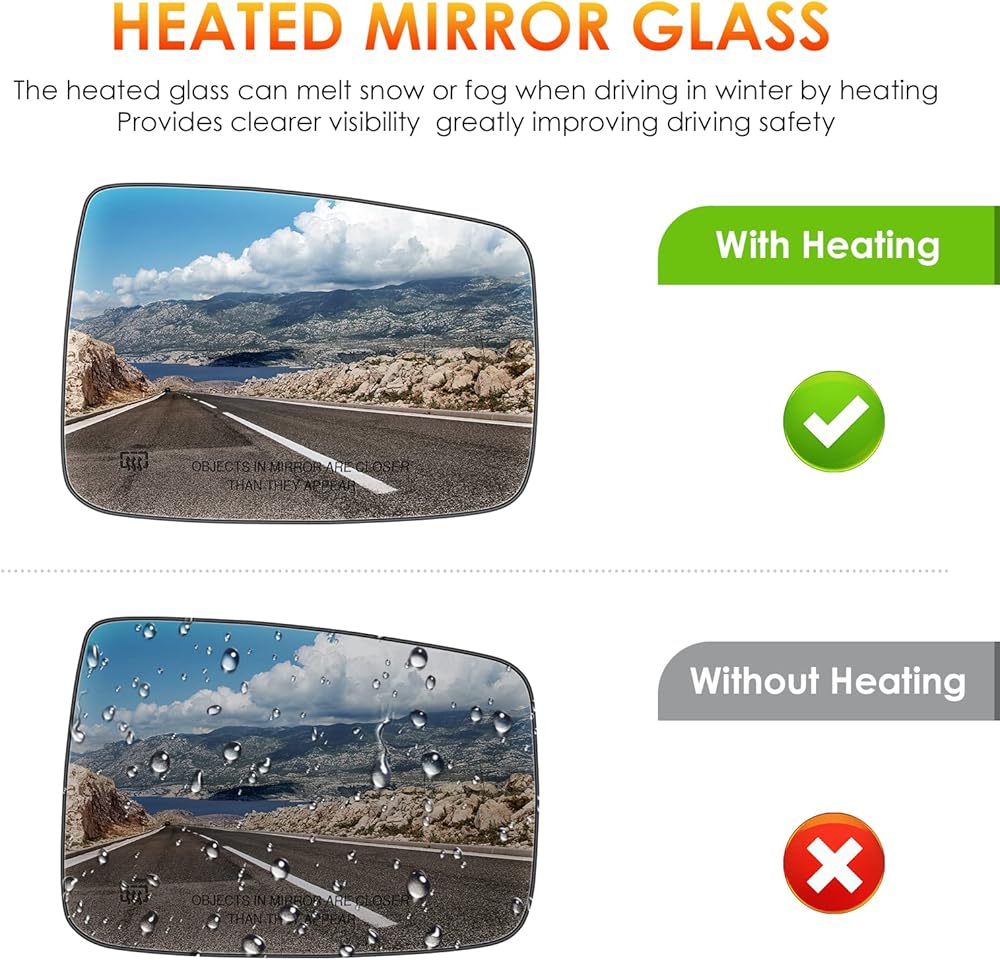 【الزجاج المرآة المدفأة الجانبية】: يمكن أن يذوب هذا الزجاج المسخن الثلج أو الضباب عند القيادة في فصل الشتاء عن طريق التدفئة. يوفر رؤية أكثر وضوحًا عند القيادة في الثلج أو المطر ، وتحسين سلامة القيادة بشكل كبير