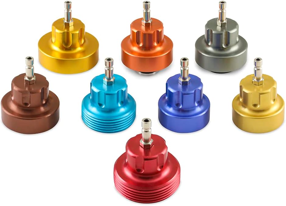 تتضمن 8 محولات من الألومنيوم مرمزة بالألوان و4 أغطية اختبار لتناسب معظم السيارات المستوردة والمحلية