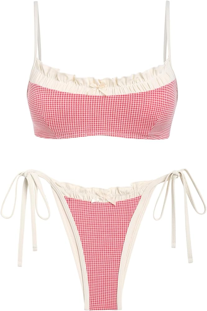 طقم بيكيني من سيماولي مصنوع من القماش القطني المكشكش مزين بكشكشة وربطة عنق وربطة عنق جانبية