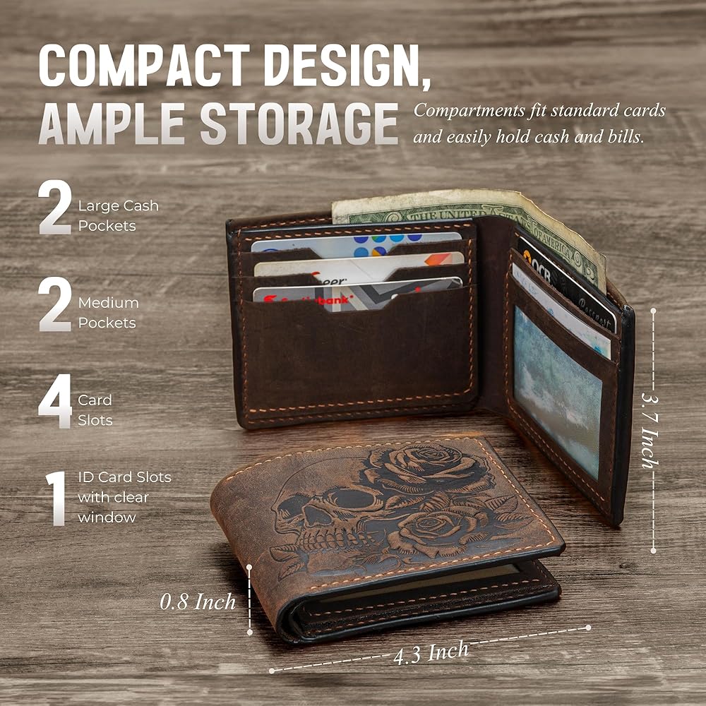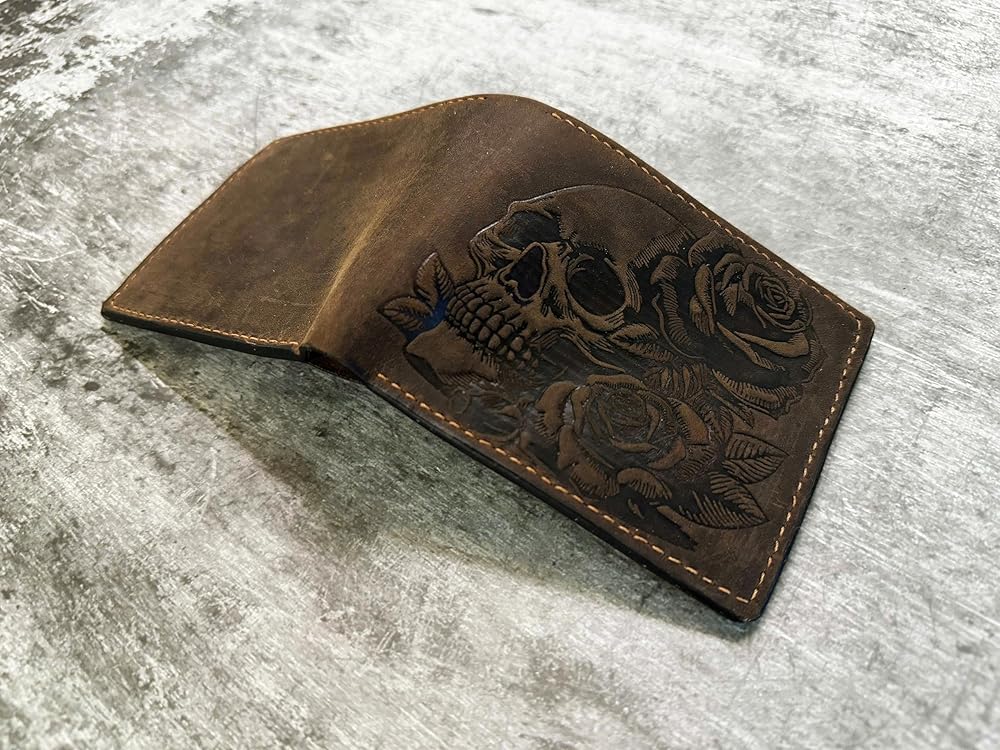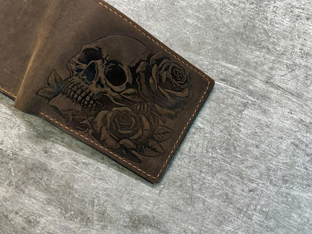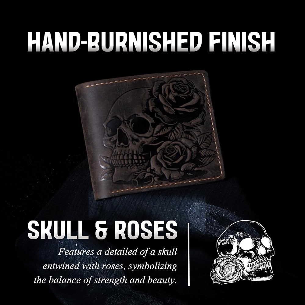 - تصميم فريد: تتميز هذه المحفظة بجمجمة جذابة ونمط وردة منقوشة في الجزء الخارجي من الجلد الأصلي.