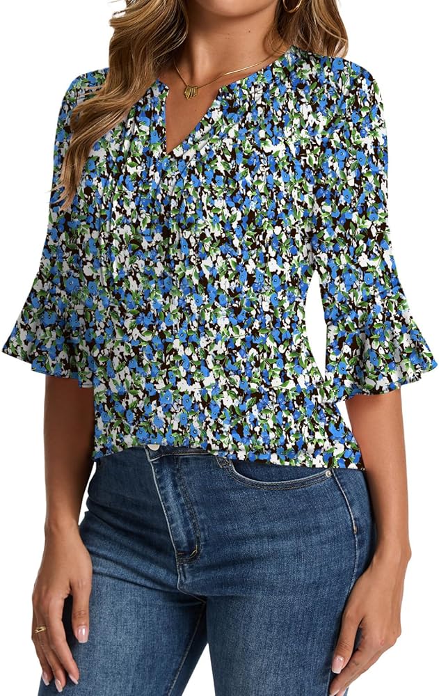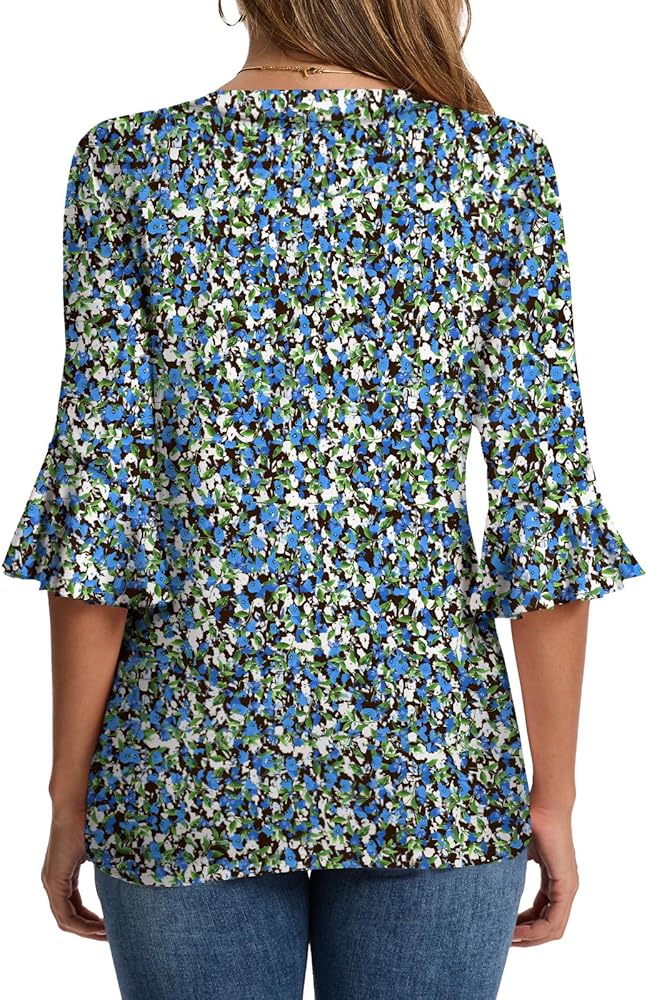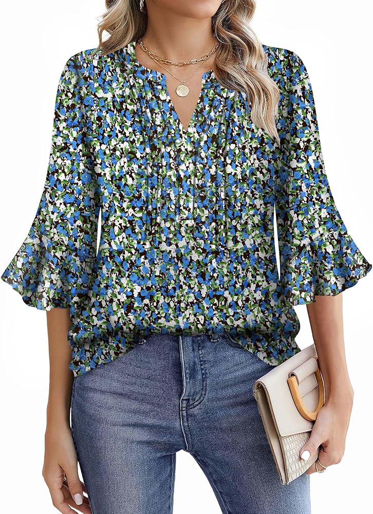 تصميم أنيق وعصري-يتميز قمة الصيف بالسيدات هذه بطبعة زهرية أنيقة مع خط خطي شديد ، وواجهة مطوية دقيقة ، وأكمام أنيقة 3/4 مع تفاصيل الكشكشة ، مما يجعلها إضافة أنيقة إلى خزانة ملابس الصيف النسائية الخاصة بك