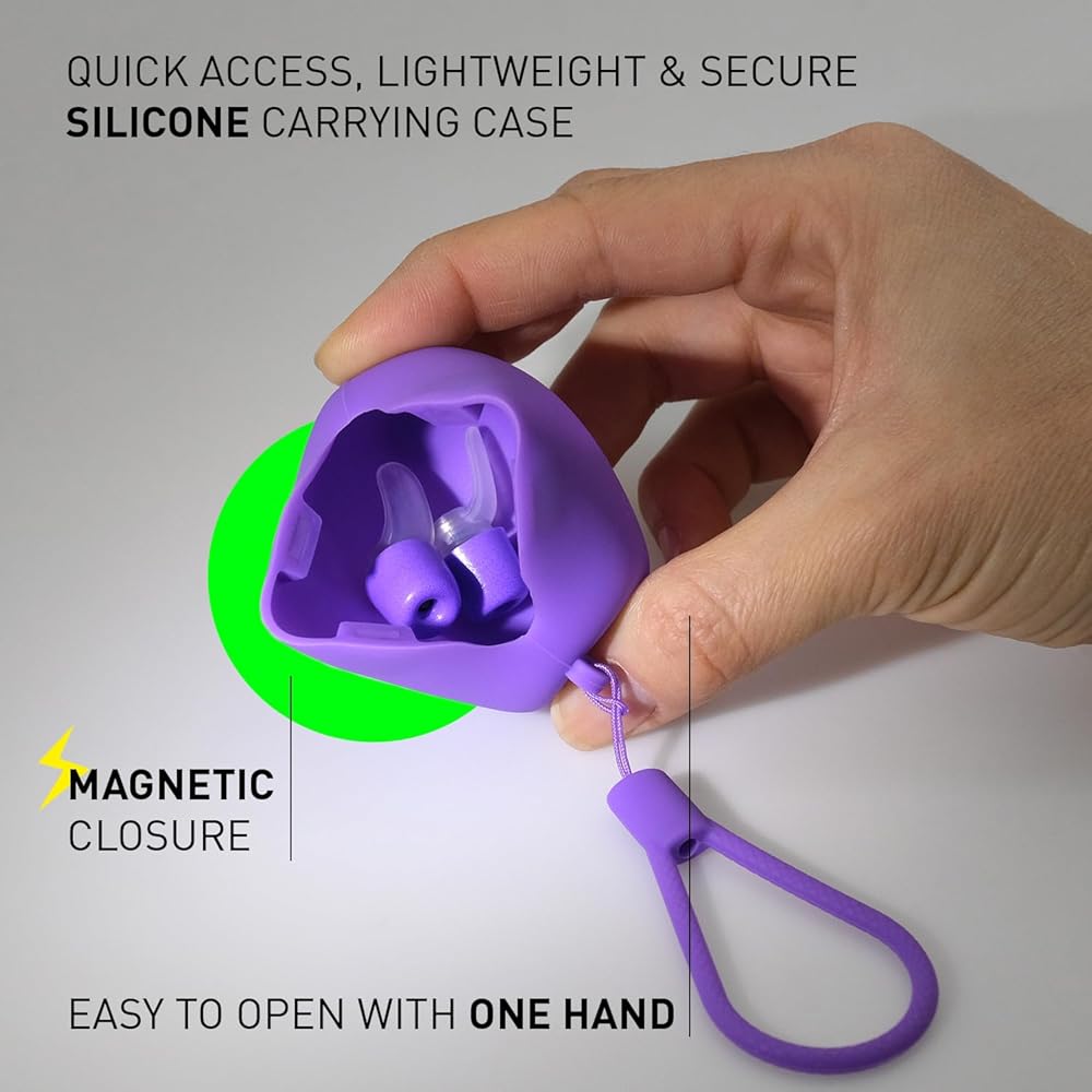 【EASY-ACCESS MAGNETIC CASE】 Color matching silicone carrying case and finger strap included. The carrying case is designed with magnetic opening mechanism for single-hand operation to easily grab and store the Eartune Live Foam ear plugs.
