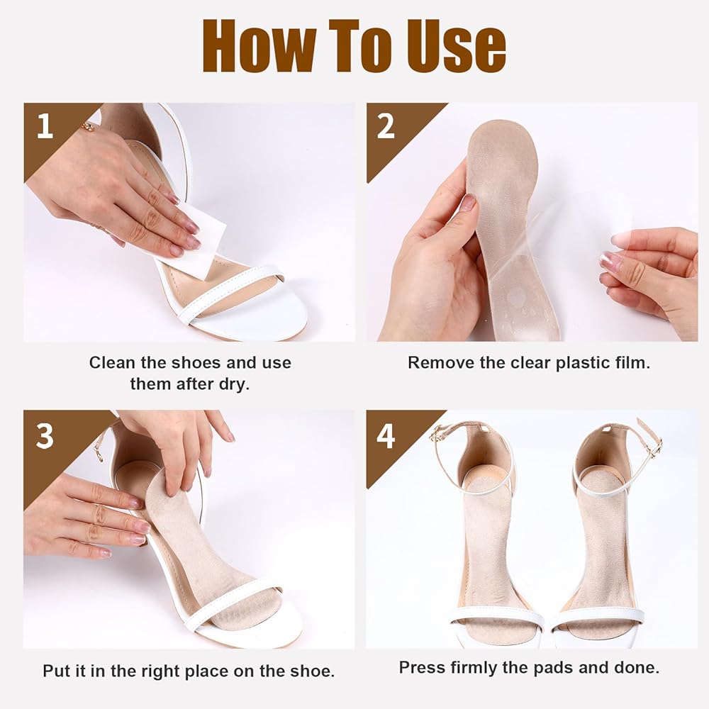 【Upgraded Design】Shoe inserts for women heels are made of high-quality gel material, with strong self-adhesiveness on the bottom to ensure a secure fit and prevent movement in the shoe, the gel high heel comfort pads have a larger area to ensure that it sticks firmly to your shoes and provides greater shock absorption for your feet