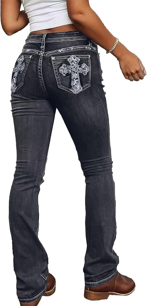 الجينز Flamingals Bootcut للنساء Mid Rise High Stretch Strend Cremny Jeans العصرية التطريز الجينز الجينز in Kuwait