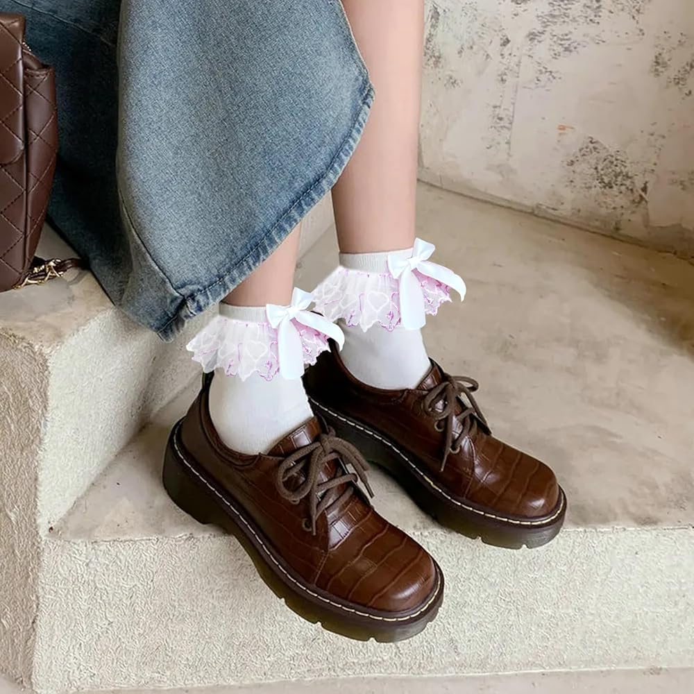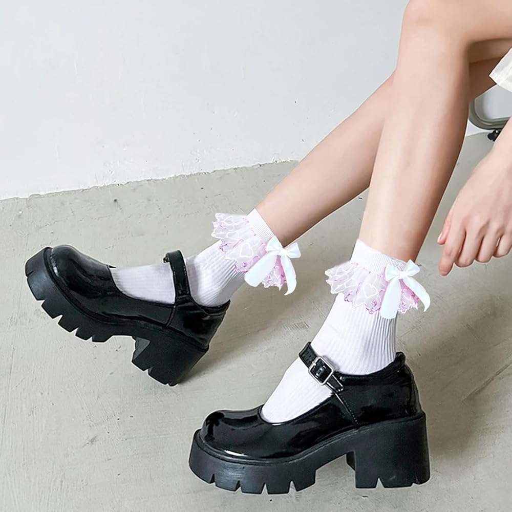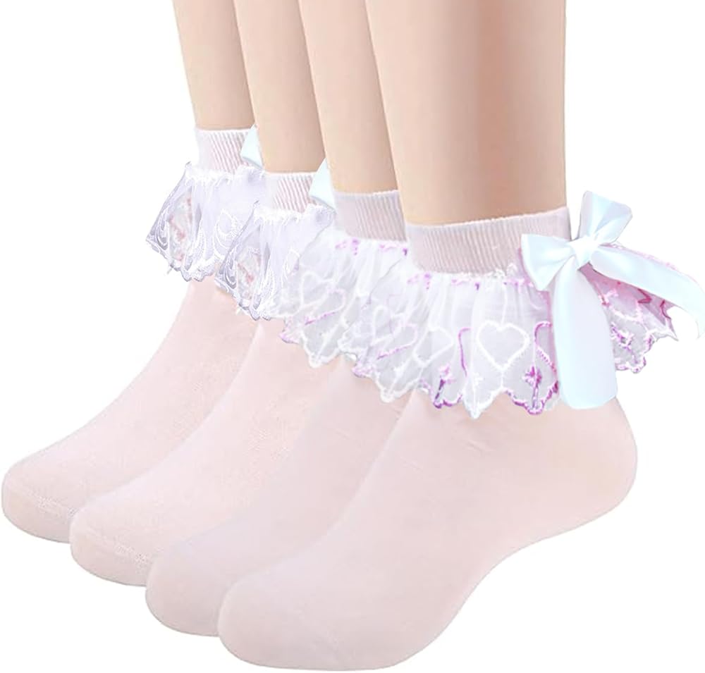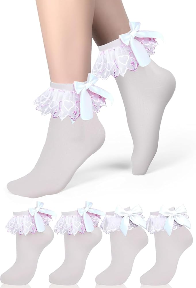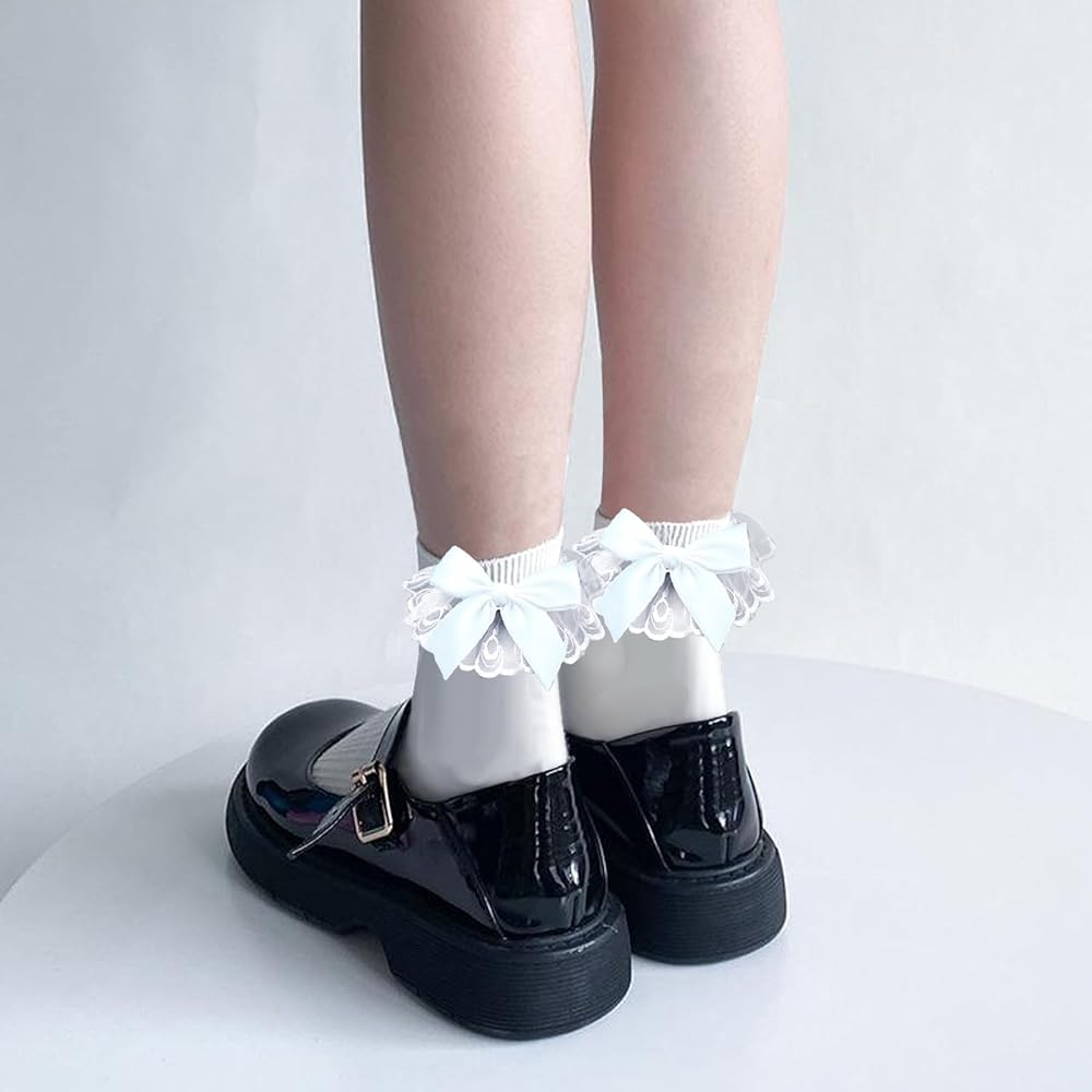 Package Contents: 4 Pair white cotton bow socks with lace ruffles