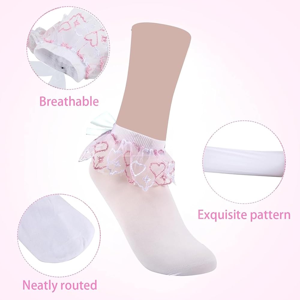 【Size & Color】 The white lace ankle socks for women fit women's shoe size 5-9.The package contents 2 pairs of lace bow socks women,the lace ruffle pattern is a little different,soft and breathable,providing a more health and confortable fit, these ankle socks fit for most big girls and women,Perfect For All Season