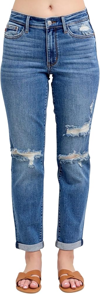 The Judy Blue Women's Mid-Rise Vintage Wash Cuffed Destroyed Boyfriend Jeans combine comfort and style in one perfect pair of jeans. Designed with a relaxed fit, these jeans feature a vintage wash that gives them a timeless, worn-in look. The mid-rise waist offers a comfortable fit, sitting just below the belly button for a flattering silhouette. With distressed detailing and cuffed hems, these jeans capture the essence of effortless, laid-back style, making them perfect for casual outings or adding a touch of edge to your everyday wardrobe.