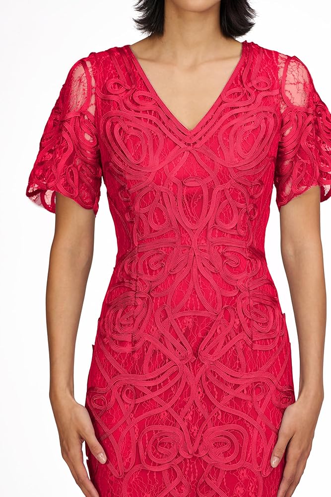 Embrace elegance in this stunning midi dress, crafted from stretch lace with a placed soutache pattern for a rich, textured look. Featuring delicate flutter sleeves in soutache and a flattering silhouette with slight stretch, this dress is perfect for sophisticated occasions.