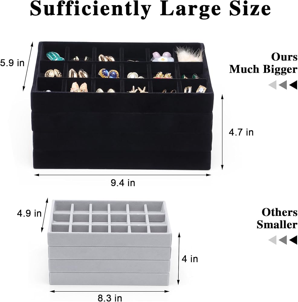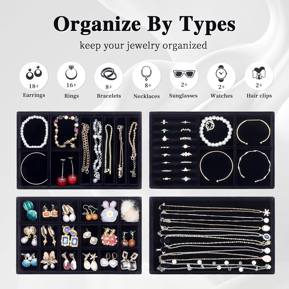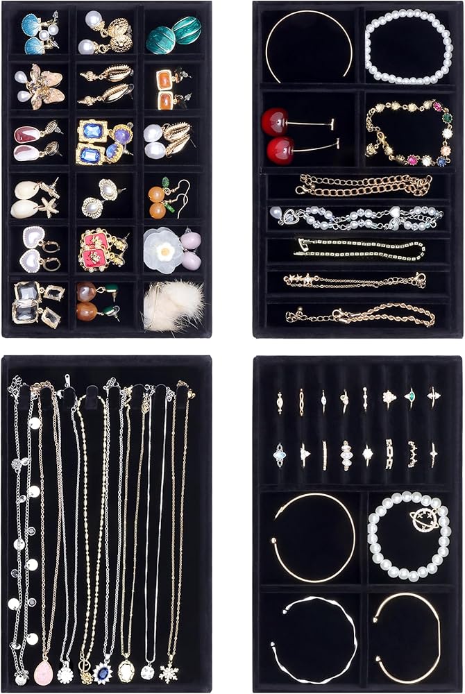 • 4 مجموعة مجوهرات صينية: يحتوي صينية المجوهرات على 4 صواني مجوهرات قابلة للتكديس ، بما في ذلك عرض حامل الخاتم (1pc) ، و 18 أقراط منظم الشبكة (1pc) ، ودرج منظم القلادة (1pc) ، و 9 صينية للشبكة (1pc) ، وملحقات الشعر السهلة ، والمراقين ، و bracelets ، المجوهرات ، تحدد المجوهرات بسرعة لتتناسب مع الزي وتوفير الوقت