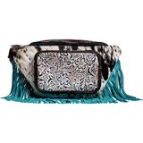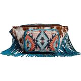 This awesome waist pack features wonderful upcycled rug paired with beautiful hair-on hide. The top is hair-on hide, while the back is rich blue leather. Interior zippered pocket, with zipper top close. Blue leather fringe drapes from the sides and bottom. Adjustable waist belt in matching durable woven canvas. An amazing pack!