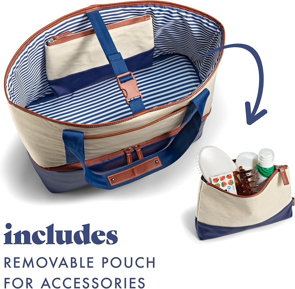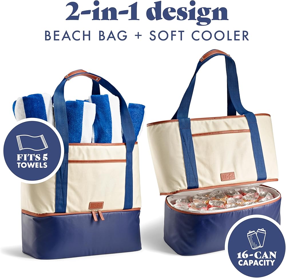 16 CAN COOLER - The bottom of this insulated beach tote has a leakproof soft sided cooler compartment. Fits up to 16 cans and plenty of ice packs to keep your food and drinks extra cold. The best bag with cooler compartment for days in the sun!