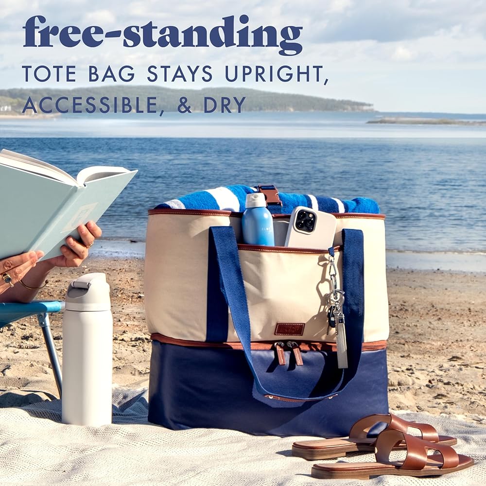 TOTE COMPARTMENT - Store all your dry beach accessories in the top lined portion of this beach bag cooler combo. Holds up to 5 towels, blankets and more. Includes a snap-in accessory pouch, front pocket key leash, and buckle closure for easy access.