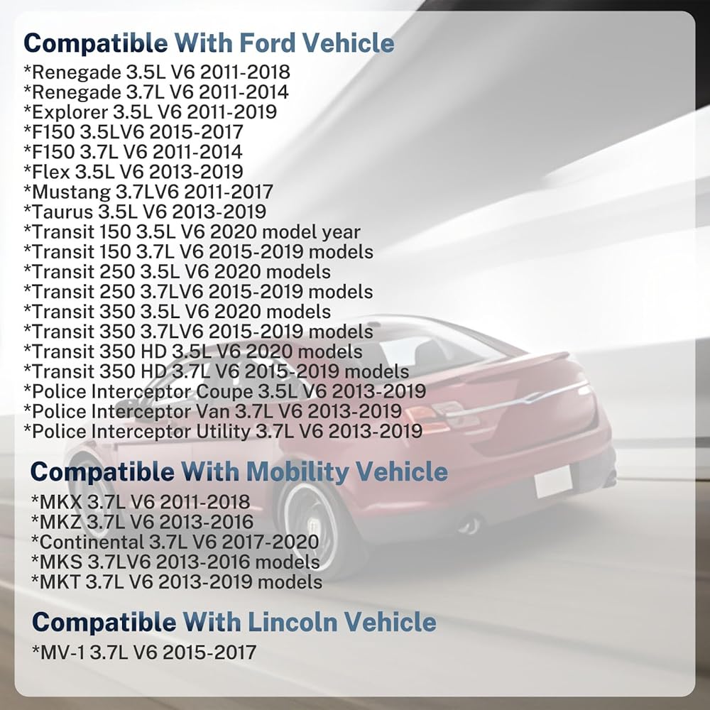 【FIT FOR 1】 - Compatible With Ford Vehicle Renegade 3.5L V6 2011-2018, Renegade 3.7L V6 2011-2014, Explorer 3.5L V6 2011-2019, F150 3.5L V6 2015-2017, F150 3.7L V6 2011-2014, Flex 3.5L V6 2013-2019, Mustang 3.7L V6 2011-2017, Taurus 3.5L V6 2013-2019, Transit 150 3.5L V6 2020 model year, Transit 150 3.7L V6 2015-2019, Transit 250 3.5L V6 2020, Transit 250 3.7L V6 2015-2019, Transit 350 3.5L V6 2020, Transit 350 3.7L V6 2015-2019, Transit 350 HD 3.5L V6 2020, Transit 350 HD 3.7L V6 2015-2019, Police Interceptor Coupe 3.5L V6 2013-2019, Police Interceptor Van 3.7L V6 2013-2019, Police Interceptor Utility 3.7L V6 2013-2019. 【FIT FOR 2】- Compatible with Mobility Vehicles 2015-2017 MV-1 3.7L V6. | Compatible with Lincoln vehicles Continental 3.7L V6 2017-2020, MKS 3.7L V6 2013-2016, MKT 3.7L V6 2013-2019, MKX 3.7L V6 2011-2018, MKZ 3.7L V6 2013-2016.
