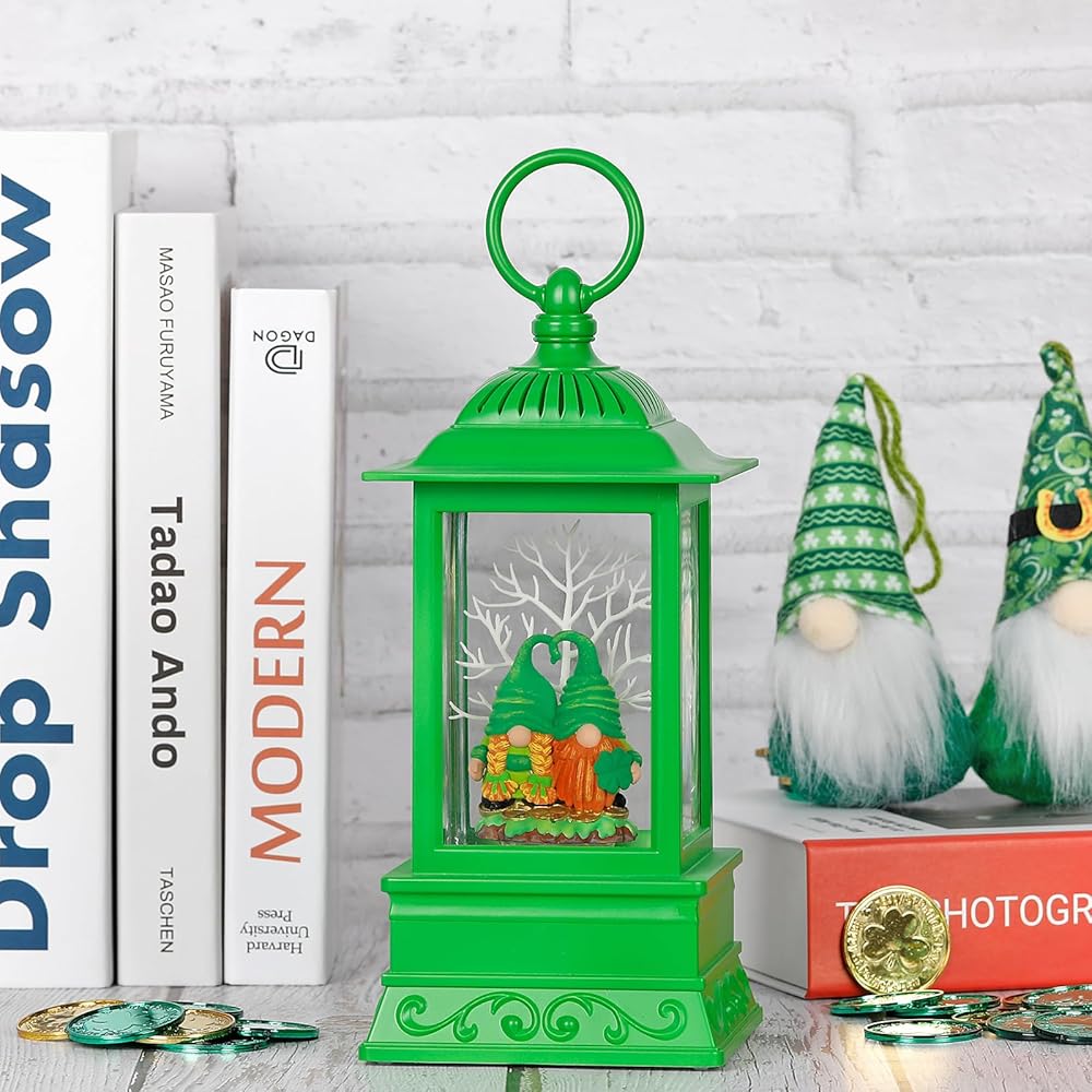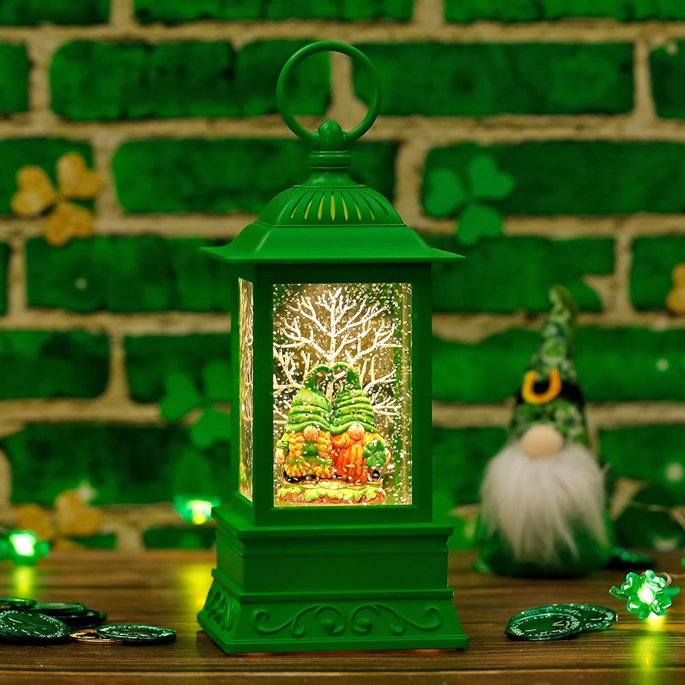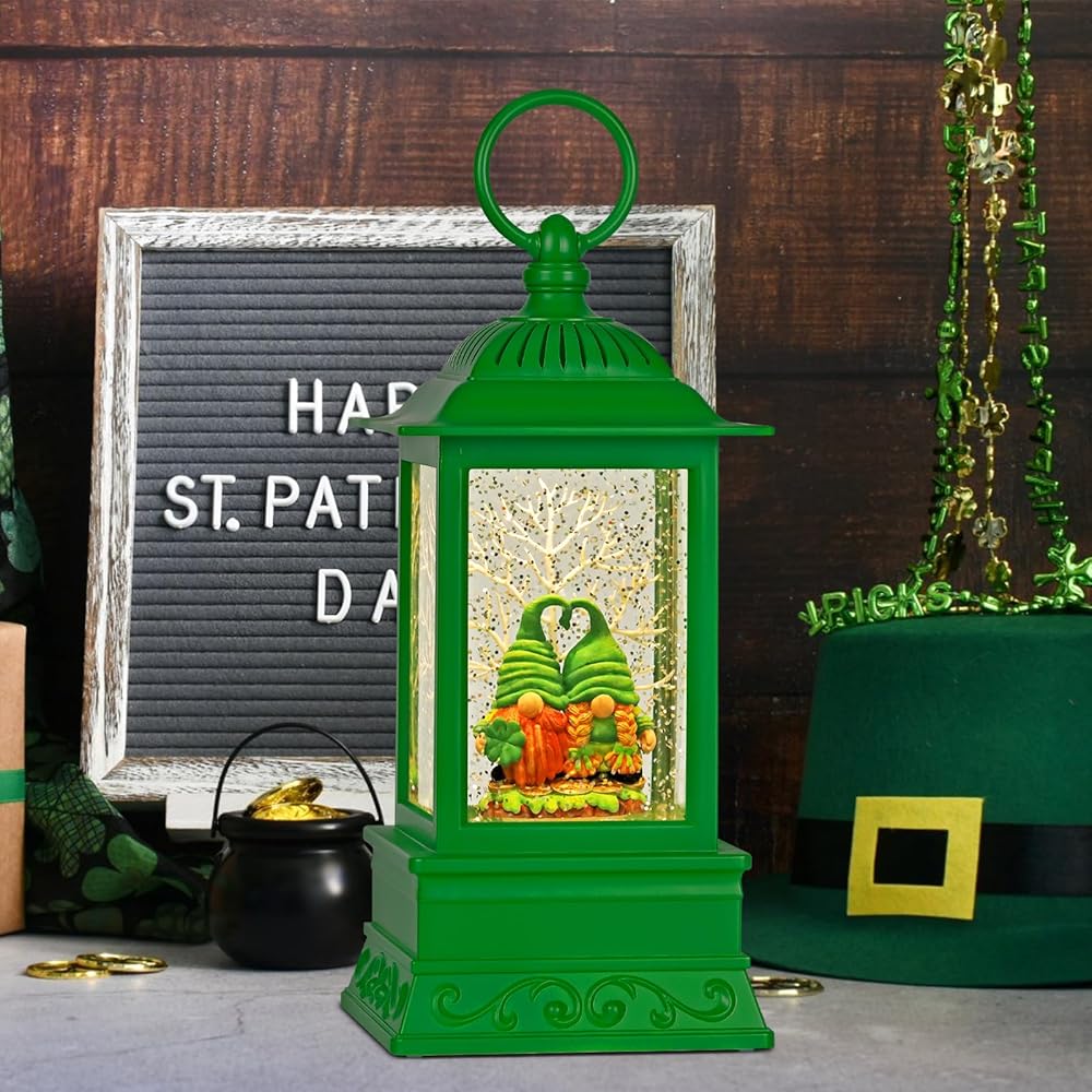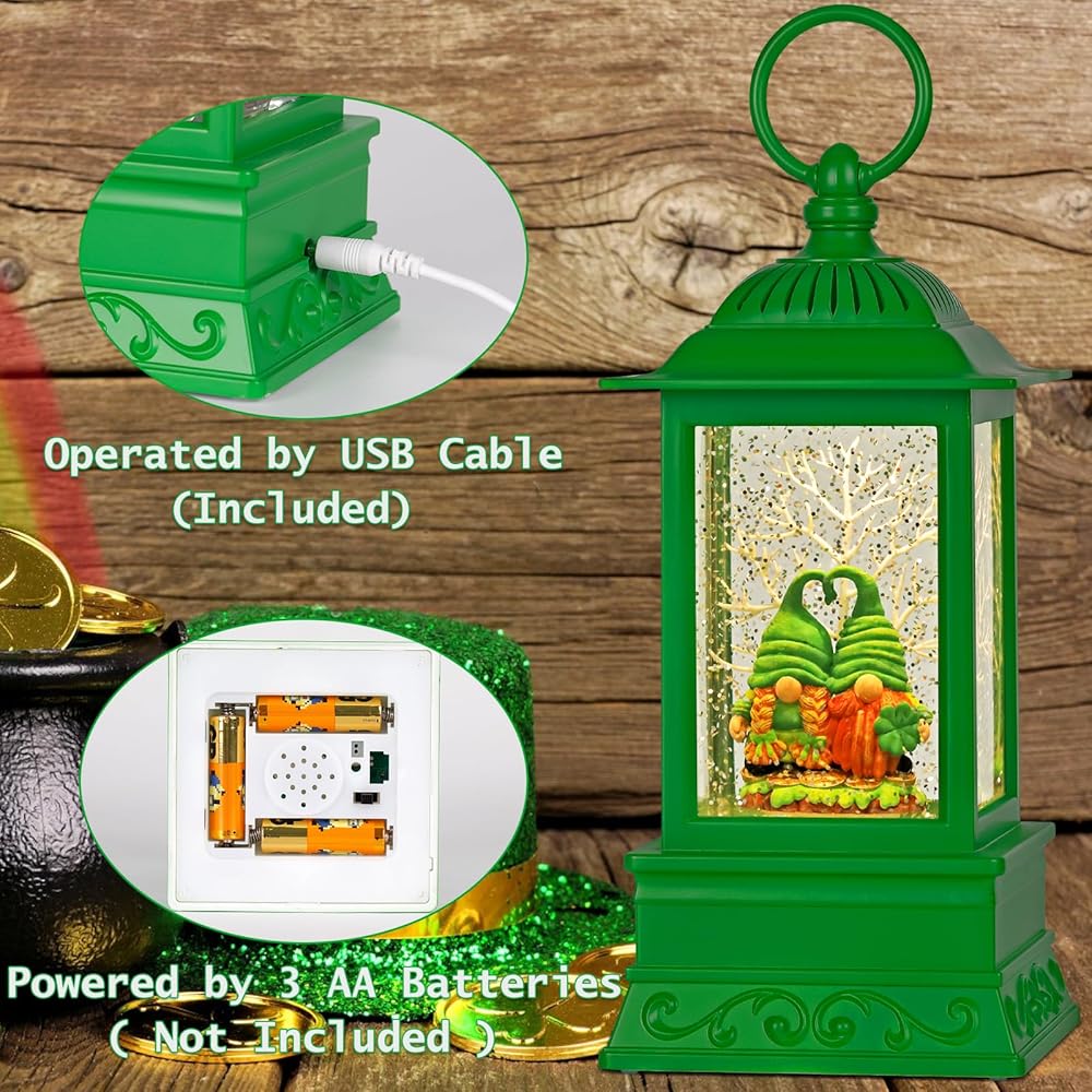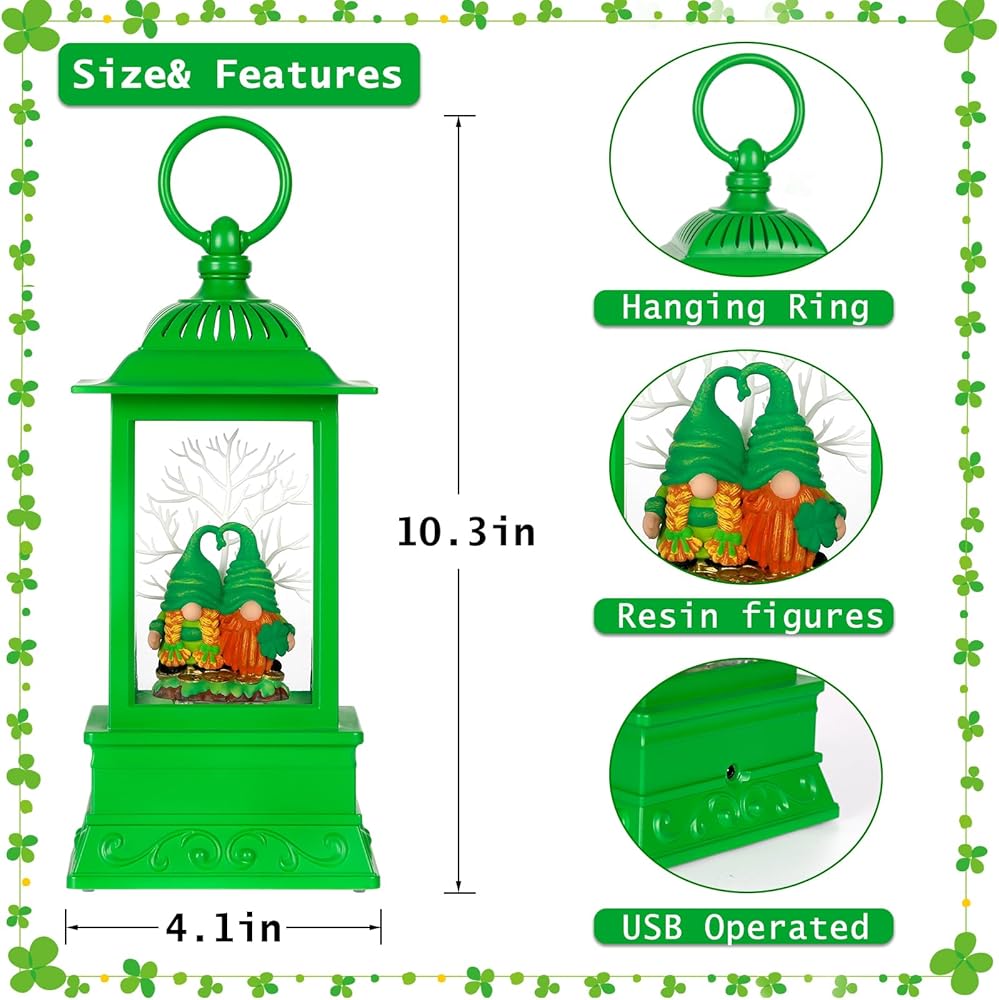 مشهد حساس: فانوس سانت باتريكز المثيرة للاهتمام والمثيرة للاهتمام. يضم اثنين من التماثيل مع البرسيم المكون من أربع أوراق ، عندما تكون الطاقة في وضع التشغيل ، تدور رقائق بريق حول التماثيل تلقائيًا ، وتستبعد الإضاءة الناعمة كرة الثلج أكثر روعة. كرة الثلج هي ببساطة مذهلة وسوف تجلب الفرح والسعادة إلى منزلك