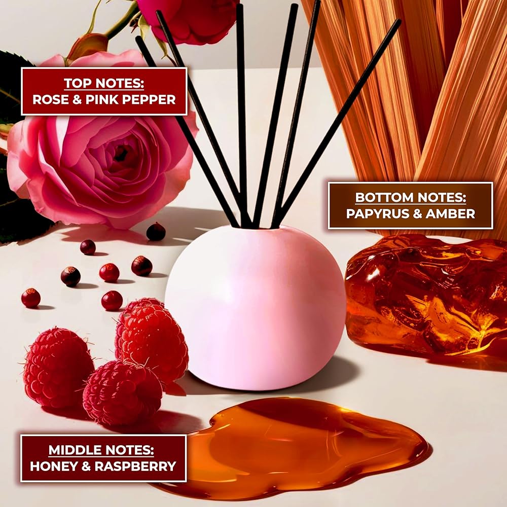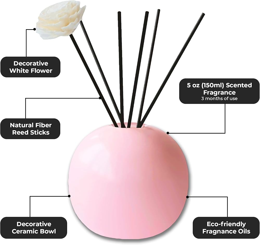 رائحة أمبور ، مجموعة ناشر القصب ، عطر المسك الأبيض في وعاء الرائحة السيراميك وقاعدة زجاجية ، 5 أوقية (150 مل) - 5 عصي القصب الألياف الطبيعية زهرة زخرفة - ديكور المنزل والمكتب الأنيق (وردة)