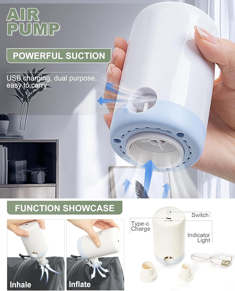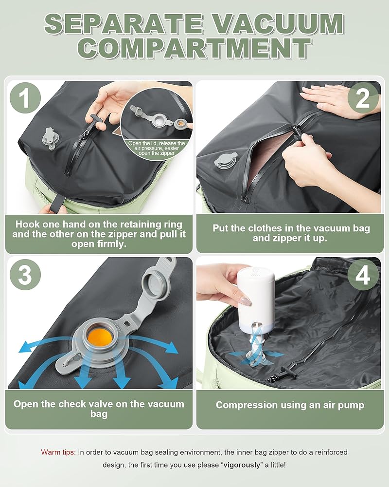 【كيس ضغط الفراغ ومضخة الهواء】 توجد حقيبة ضغط فراغ داخل أكبر مقصورة من حقيبة الظهر ، يمكنك وضع الملابس في كيس الفراغ ، وتشديد السوستة ، وفتح صمام العادم أحادي الاتجاه ، واستخدام مضخة الهواء لضغط الفراغ لتقليل حجم العناصر التي تحتل المجلد ، وتحميل المزيد من الأشياء. يرجى ملاحظة أن السوستة المستخدمة في حقيبة الفراغ تتطلب المزيد من القوة لسحبها ، وهذا هو التأكد من أن مكنسة الهواء ، وليس تلف السوستة ليس سلسًا.