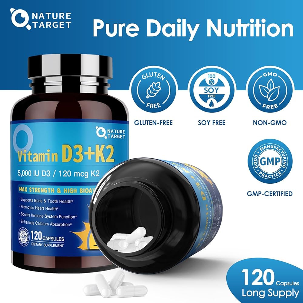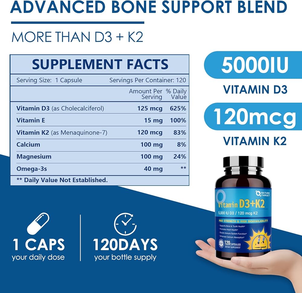 تجربة فوائد التآزر التي تمت ترقيتها: كل كبسولة توفر 5000 وحدة دولية من فيتامين D3 ، و 120 ميكروغرام من فيتامين K2 ، و 15 ملغ من فيتامين E ، جنبا إلى جنب مع مكونات قوية أخرى. تدعم هذه الصيغة المتقدمة الأسنان الصحية والعظام والعضلات ، وتعزز صحة القلب ، وتعزز الجهاز المناعي - مما يوفر الحماية الصحية والحيوية الشاملة.