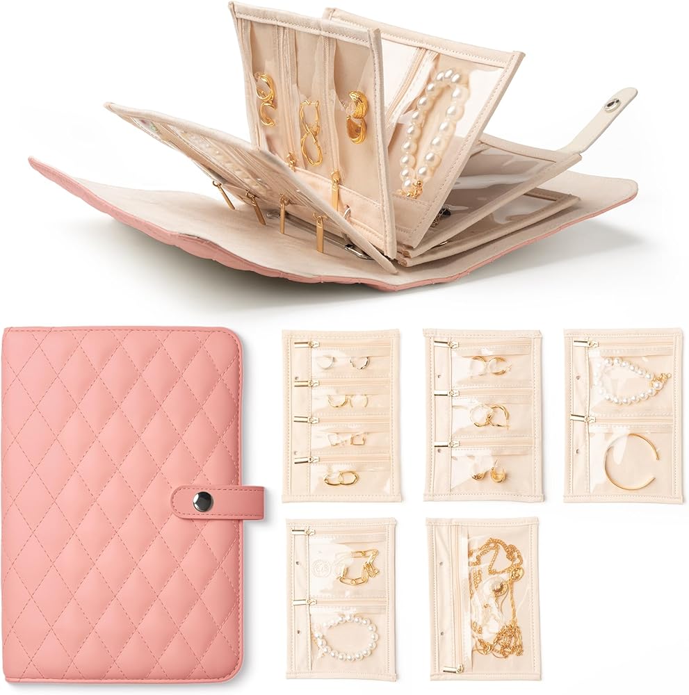 منظم مجوهرات السفر متعدد الاستخدامات : 5 صفحات قابلة للإزالة (1 كبيرة + 2 متوسطة + 3 شبكات صغيرة) قلادة المتجر ، الأساور ، الأقراط ، وأكثر من ذلك-لمدة 5-7 أيام من السفر أو الاستخدام اليومي.