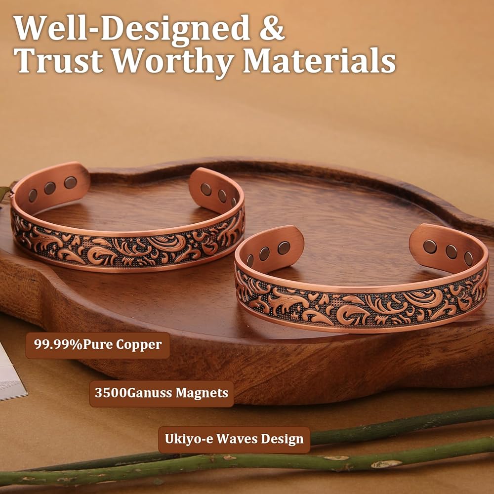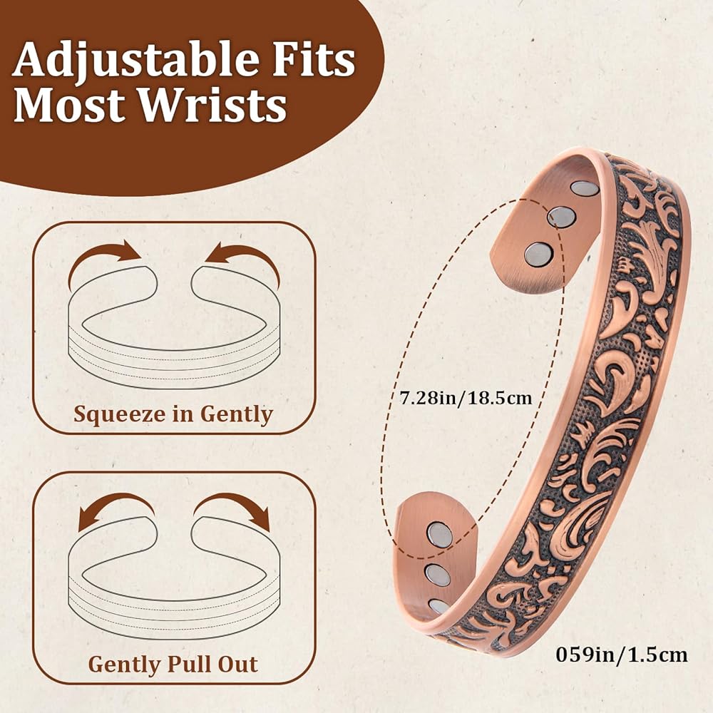 Premium Quality :Crafted Magnetic Bracelet is Made With Premium-Quality Copper, Lead & Nickel Free, Scratches Resistant. Bring You The Best Experience With The Best Quality!Suitable For Many Occasions:Our Magnetic Bracelet Is Suitable For Many Occasions. Wearing It, You Are The Most Eye-Catching In The Audience, And Everyone Will Be Attracted To You! So Fashionable That No One Doubts It Is A Magnetic Bracelet!Adjustable Size:Thanks To The Adjustable Design, Our Copper Bracelet Fits Most people's Hands. It Looks So Stylish! The Elegant And Minimalist Design Complements Every Outfit And Can Be Worn At Any Occasion.How To Clean The Magnetic Copper Bracelet?It Is Natural For Copper To Change Its Color And Leave Green Deposits On The Skin. This Happens When The Copper Reacts With Water Or Air, By The Process Called Oxidization, And This Is A Natural Process. The Green Deposits On The Skin Can Be Easily Washed Off With Soap and Water.Soak The Bracelet In A Mix Of Water Lemon Juice Or Vinegar. Rinse The Bracelet With Warm Water And Dry Thoroughly With A Soft Cloth. Apply Tomato Ketchup On The Bracelet Rinse With Warm Water And Dry Thoroughly With A Soft Cloth.