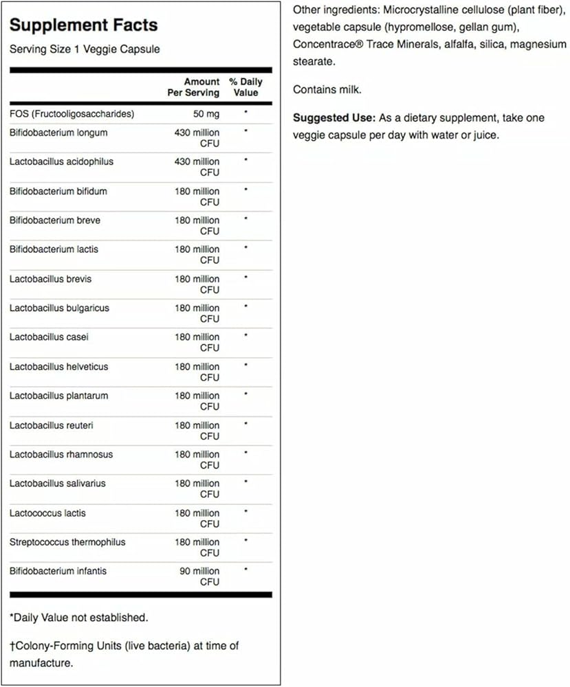 A potent probiotic blend, Dr. Stephen Langer's Ultimate Probiotic with FOS features sixteen strains of probiotics and 3.2 billion CFU per capsule to promote digestive health. That's four times the number of strains and over twice the CFUs in many popular probiotic formulations, and while other probiotic combination supplements contain only two strains of Bifidobacteria, Dr. Langer's formula delivers five. This ultimate 16-strain probiotic formula also contains ten strains of Lactobacillus, including Lactobacillus reuteri, which has a unique affinity for promoting colon health and immune system function, along with prebiotic FOS (Fructooligosaccharides) and ConcenTrace trace minerals. FOS are oligosaccharides that deliver a prebiotic effect. Trace minerals are a vital part of the enzymatic process necessary for healthy digestion and are lacking in the diets of many people.